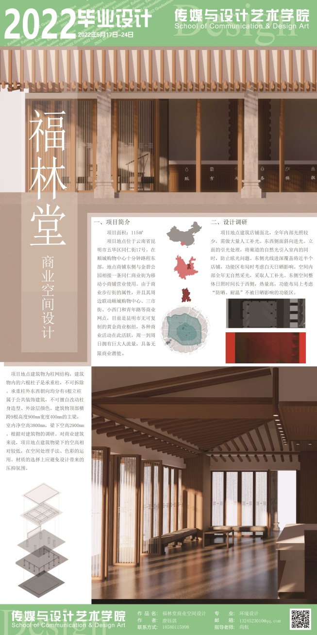 复兴传统文化,树立文化自信。地域文化中蕴含着丰富的历史,是艺术创作题材的宝库。云南少数民族服饰符号,一直是高高在上的形象,在一定程度上给传承和推广带来了难度。我们就思考怎样才能把传承千年的服饰符号带进大众视野,和我们的生活发生关联。”视觉传达设计专业的两位同学从云南最具地方特色的古林箐文化中寻找灵感,通过信息图表、实物重现、文创产品等形式再现云南民族文化的魅力。
