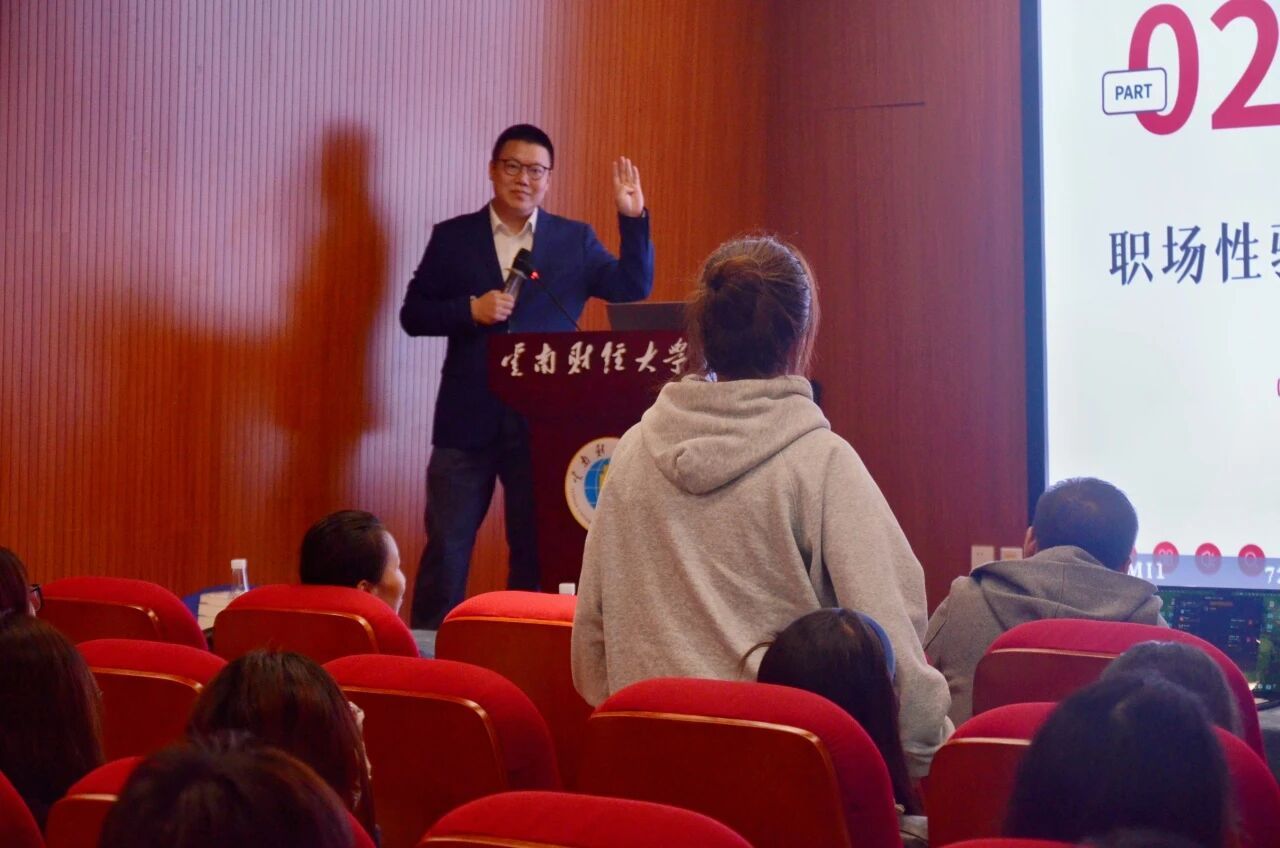 潘阳洋律师通过互动问答与书籍赠送鼓励的形式,以风趣的语言方式结合身边的真实案例,剖析劝酒、性骚扰、个人信息泄露诈骗、职场霸凌四大职场法律风险。他强调,劝酒或涉侵权可导致刑事责任,“未劝酒”亦可能追责。多个案例的列举引得同学们反响热烈,相信能让同学们对职场法律风险的识别以及应对手段有了更直观深刻的认识。