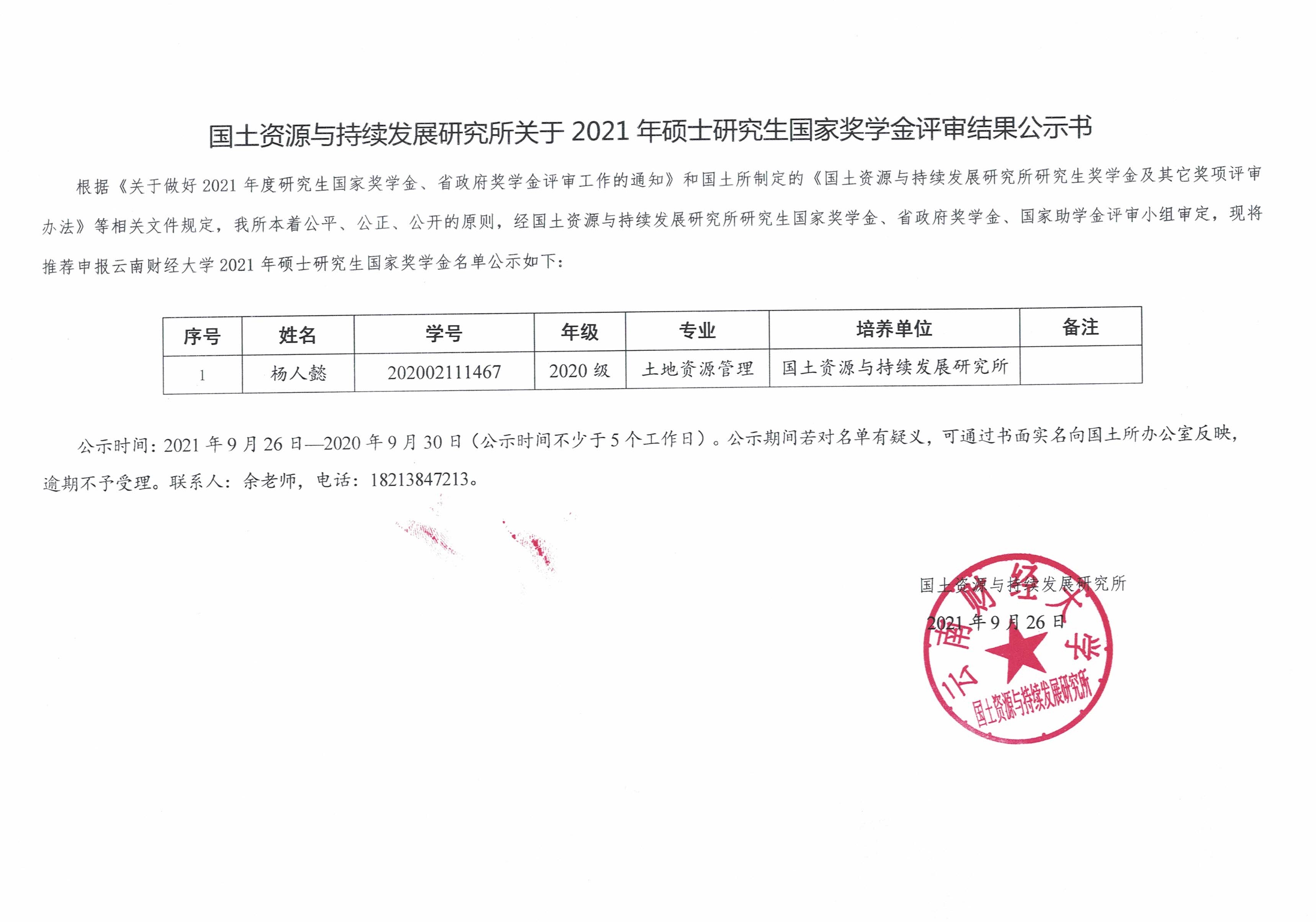 国土资源与持续发展研究所关于2021年硕士研究生国家奖学金、省政府奖学金和国家助学金评审结果公示书