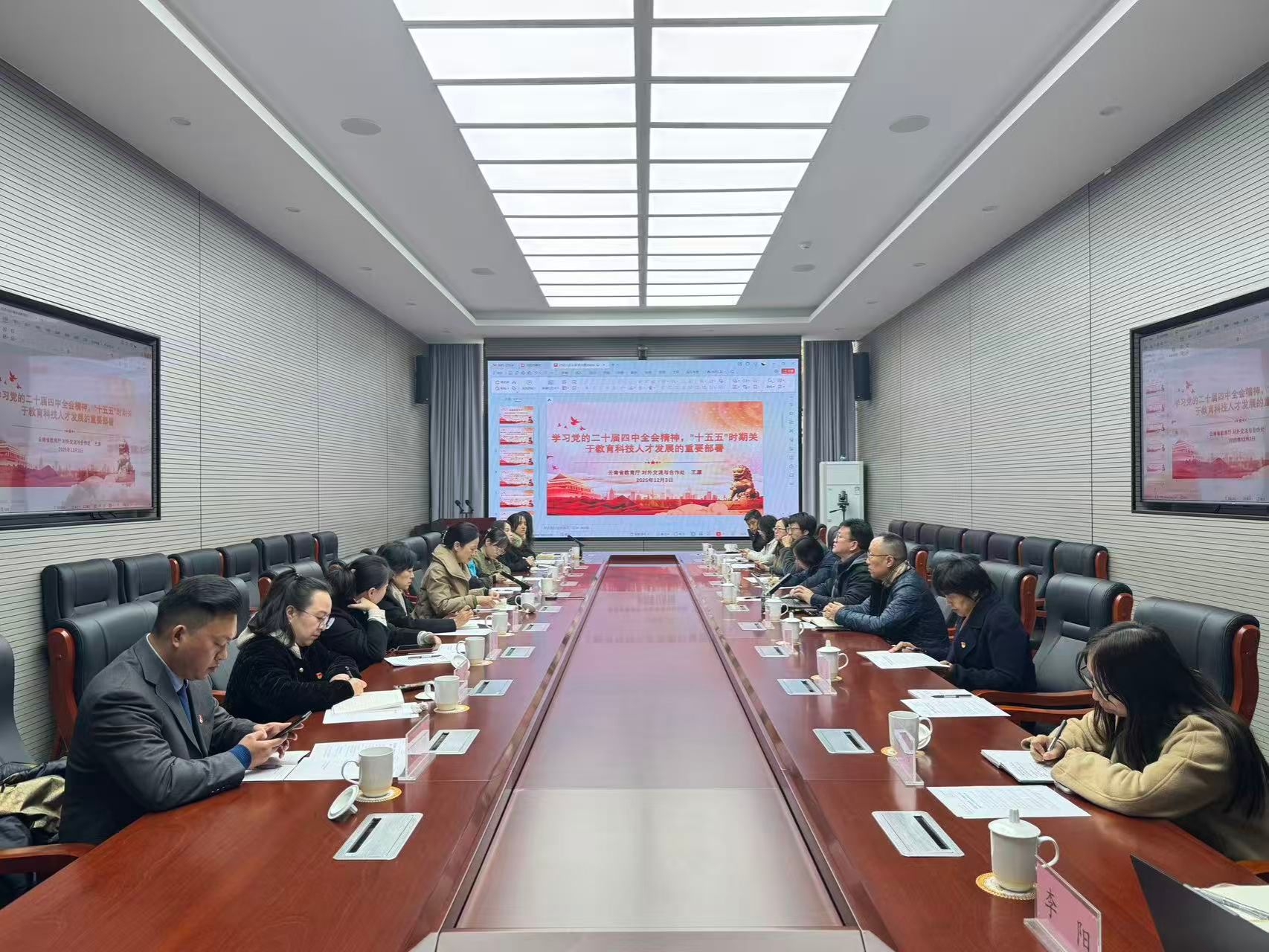 在第一议题学习环节,活动严格落实党建学习要求,开展集中理论研学。云南省教育厅对外交流与合作处党支部书记、处长王源领学,深入解读党的二十届四中全会精神,重点阐释了“十五五”时期关于教育科技人才发展的重要部署,强调要立足云南区位优势,以党建引领教育对外开放高质量发展。随后,罗梓丹同志领学了习近平总书记给世界中文大会的重要回信精神,引导与会人员深刻认识中文国际教育在促进文明交流互鉴、服务国际合作中的重要作用。