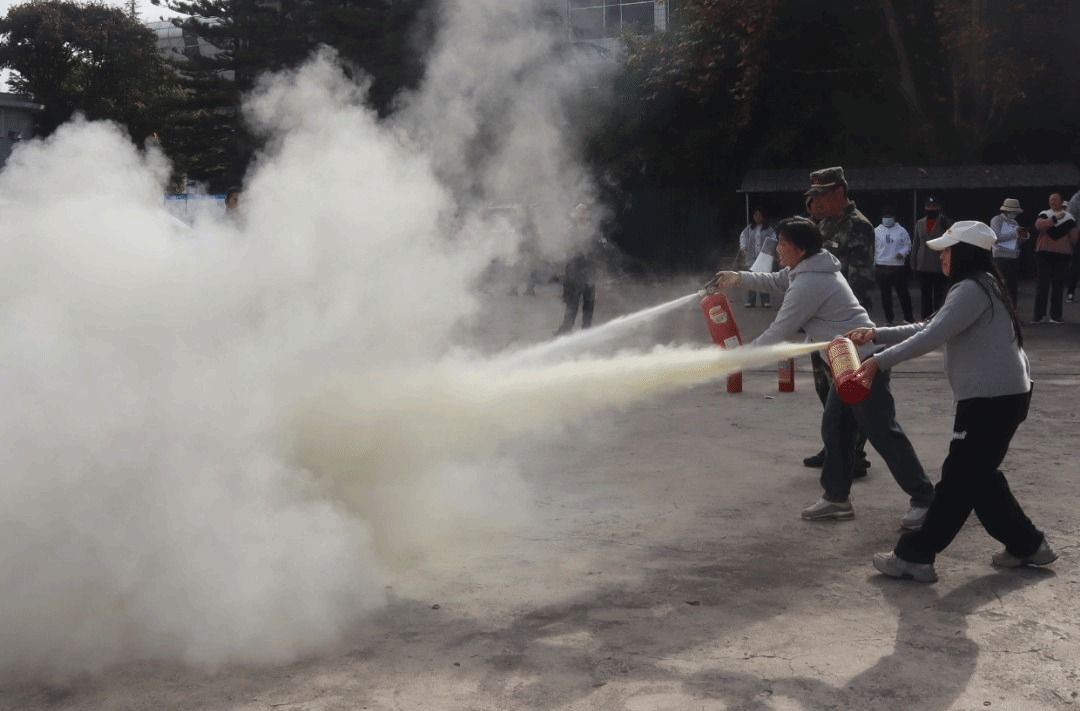 参训人员随后开展了疏散和灭火实战演练。模拟火灾现场,大家按照指令,用湿巾捂住口鼻、压低身姿,按照预设路线快速有序撤离到安全地带;在专业人员的指导下,大家正确使用灭火器、准确把握操作规程并成功灭火。