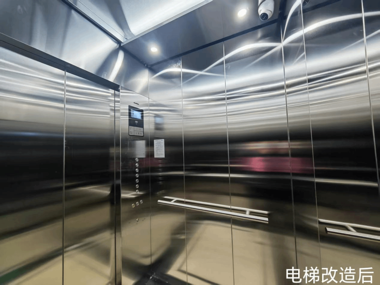 改造后的电梯节能降噪、运行稳定、安全舒适。轿厢尺寸扩大至 1600mm×1400mm,更显宽敞明亮;电梯内置高清监控摄像头,一旦有电瓶车进入便能自动检测并无法关闭箱门,为有效预防电瓶车进入楼内存在易引发火灾风险提供了技术支持;电梯内安装了扶手,为高龄老人乘梯提供了“搭手便利”。