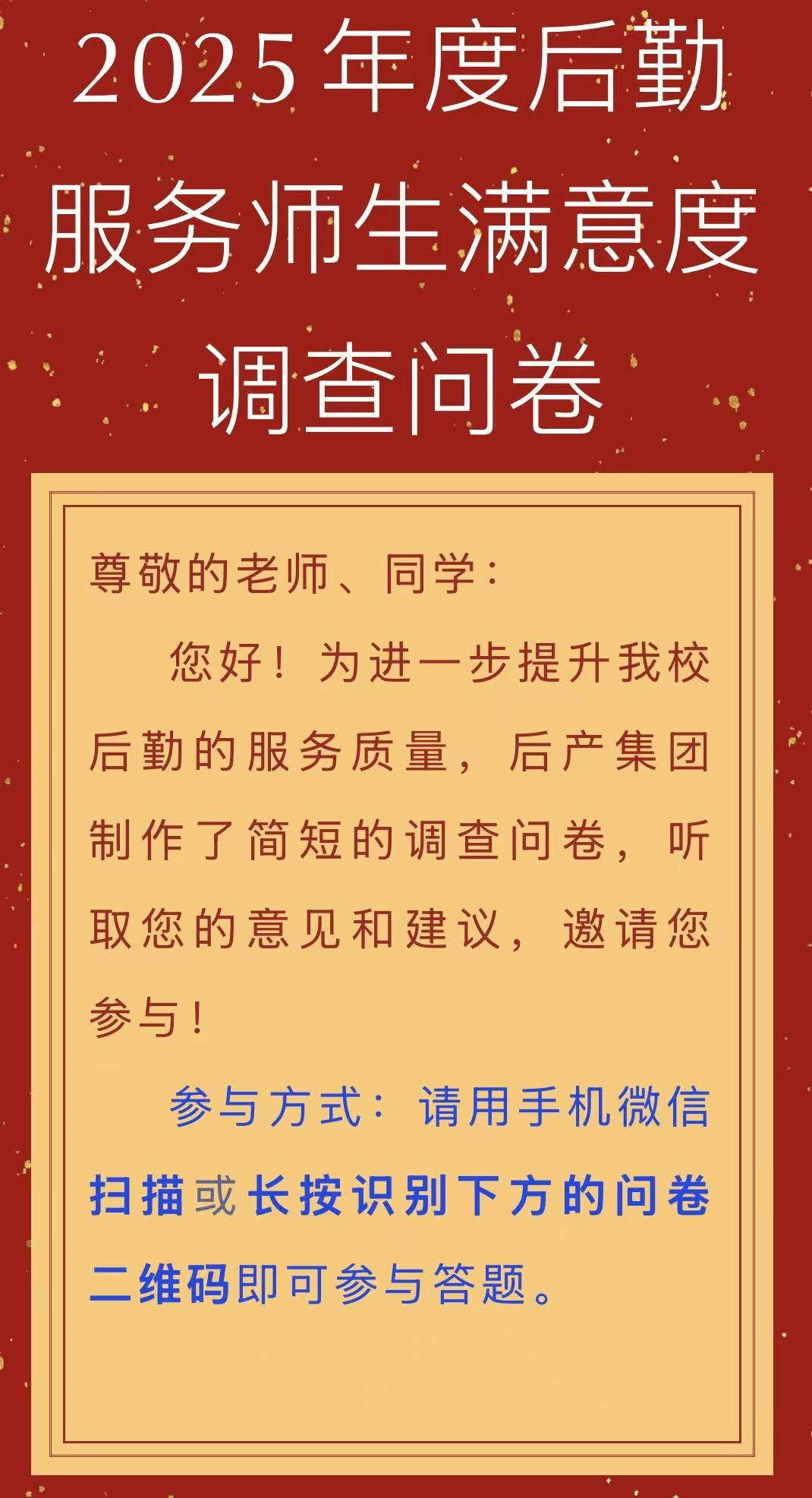 为落实ISO质量管理体系要求,精准掌握服务对象的服务需求。11月19日,后勤产业集团启动2025年度后勤服务满意度调查工作。