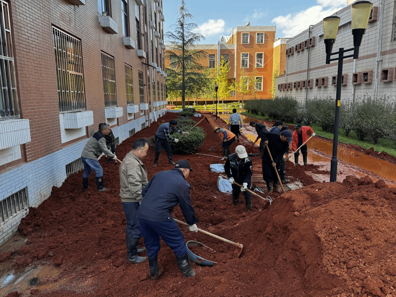 为解决蕴华3、4栋学生公寓周边绿化带因长期积水导致绿化植物受损严重,影响校园环境美观的问题。11月14日,绿化保洁中心组织实施蕴华3、4栋学生公寓周边绿化专项改造。