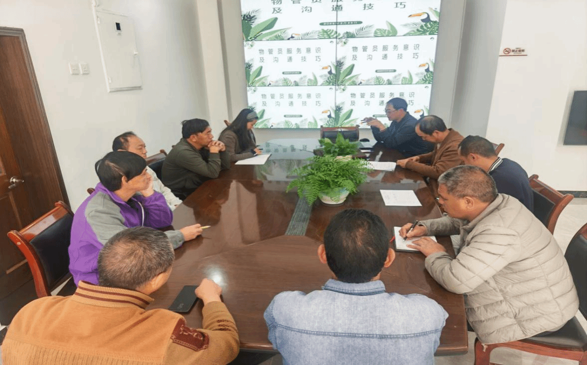 物管组组长刘云结合物业服务工作实际,围绕行业基础知识、业主投诉处理、设施设备维护、消防安全及工作规范等进行系统讲解。与会人员立足岗位实际分享工作经验与体会,开展深入交流研讨。