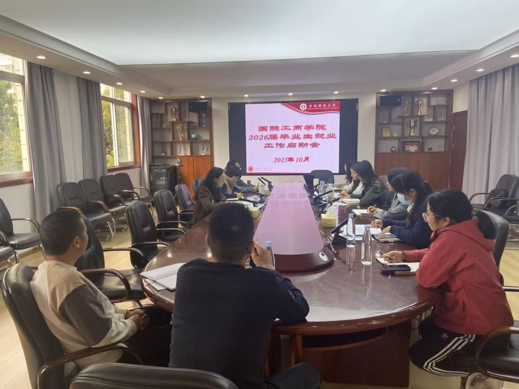 10月31日上午,国际工商学院在三楼会议室召开2026届毕业生就业工作启动会。学院党委书记杨媛妮、副书记王晶、学生管理科、教学管理科、对外合作与学生交流科负责人及2026届毕业班全体班主任参加会议,王晶主持会议。