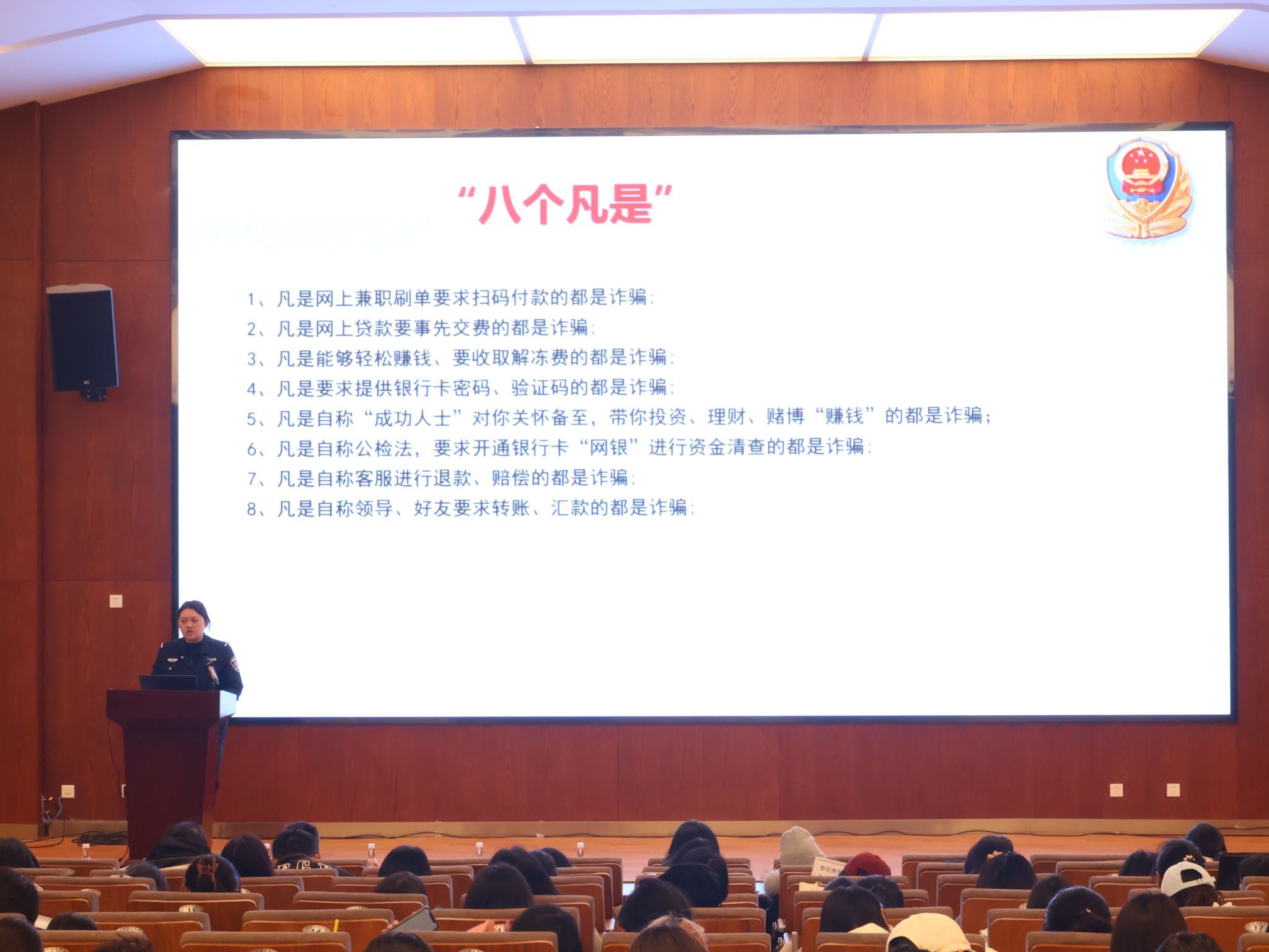 安宁市公安局反诈中心王雯警官系统分析了2025年安宁市电信诈骗案件类型,通过播放宣传片、现场讲解等方式,介绍了常见电信诈骗手段与防范措施,提醒师生不轻信陌生来电和信息,保护好个人信息与银行账户,避免成为“两卡”犯罪帮凶。
