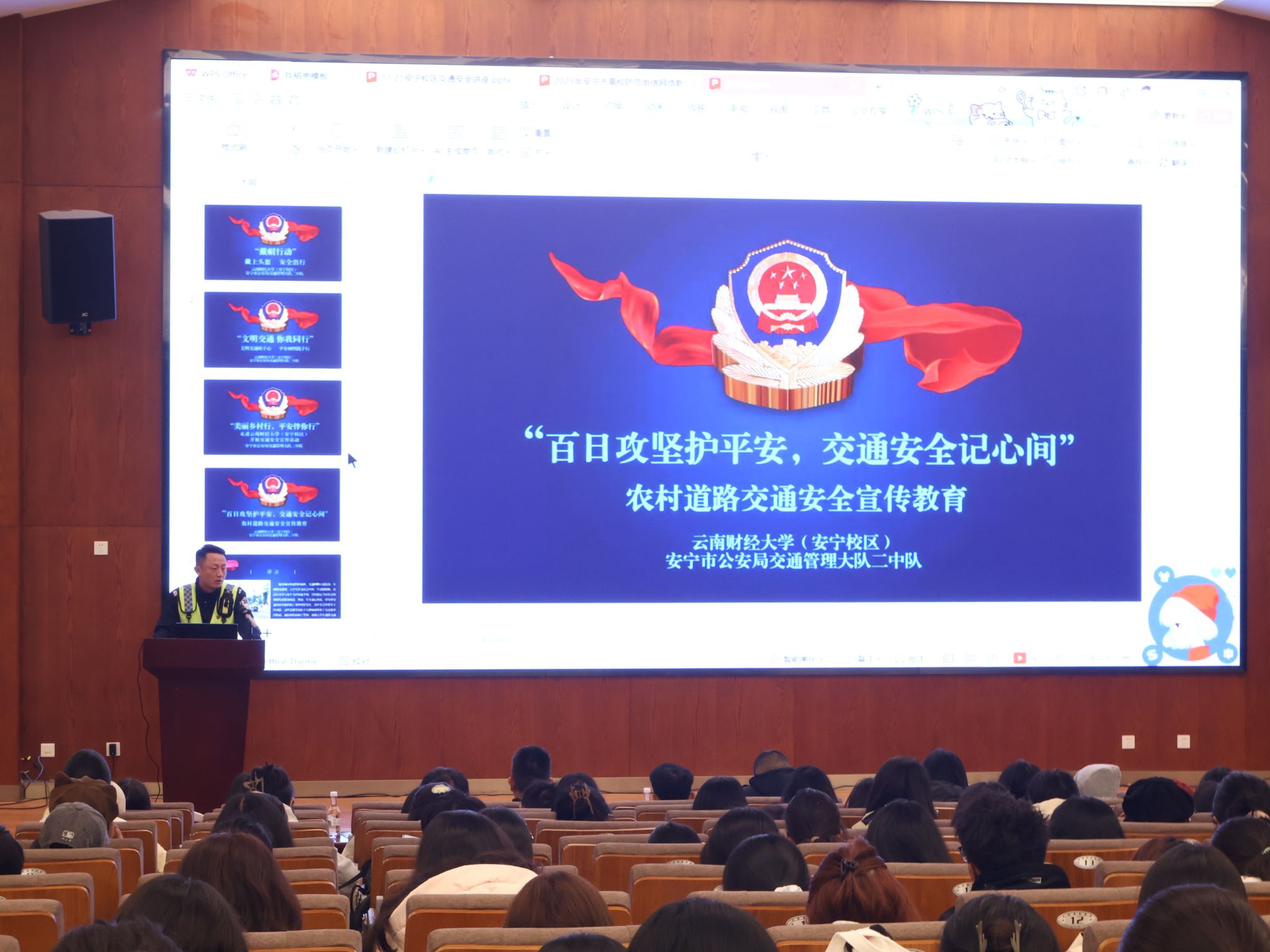 安宁市公安局交通管理大队二中队高洋警官以“百日攻坚护平安,交通安全记心间”为主题,结合大学生群体易发的交通事故类型,通过真实案例剖析了酒驾、闯红灯、分心驾驶、超速行驶等交通违法行为的危害,并详细讲解了安全出行、乘车等日常交通知识。