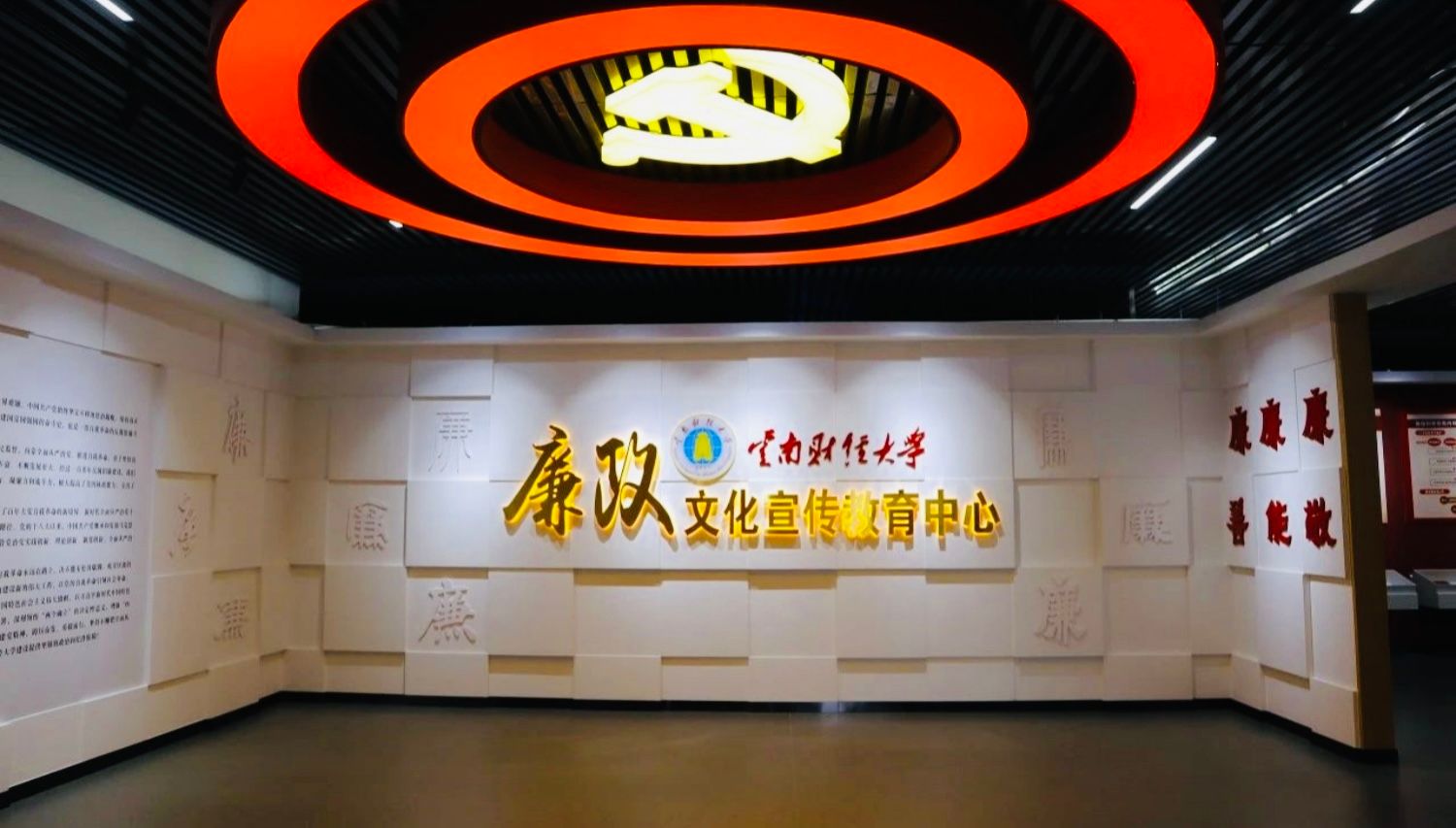 云南财经大学廉政文化宣传教育中心创建于2012年,座落于南院凌云楼北附301室,经重新设计、装修,新的廉政文化宣传教育中心于20233月正式启用,并于2024年底进行了局部内容更新。展厅设置“序厅、引领篇、崇廉篇、典型篇、使命篇”五大主题展区,参观讲解由纪检监察处管理的学生社团“育廉社”学生讲解员负责,全流程一般控制在40分钟左右,讲解后可继续自主学习。新的廉政文化宣传教育中心展厅面积260㎡,单场次最高可容纳60人参观。20233月正式启用以来至今,共接待154场次6095人。