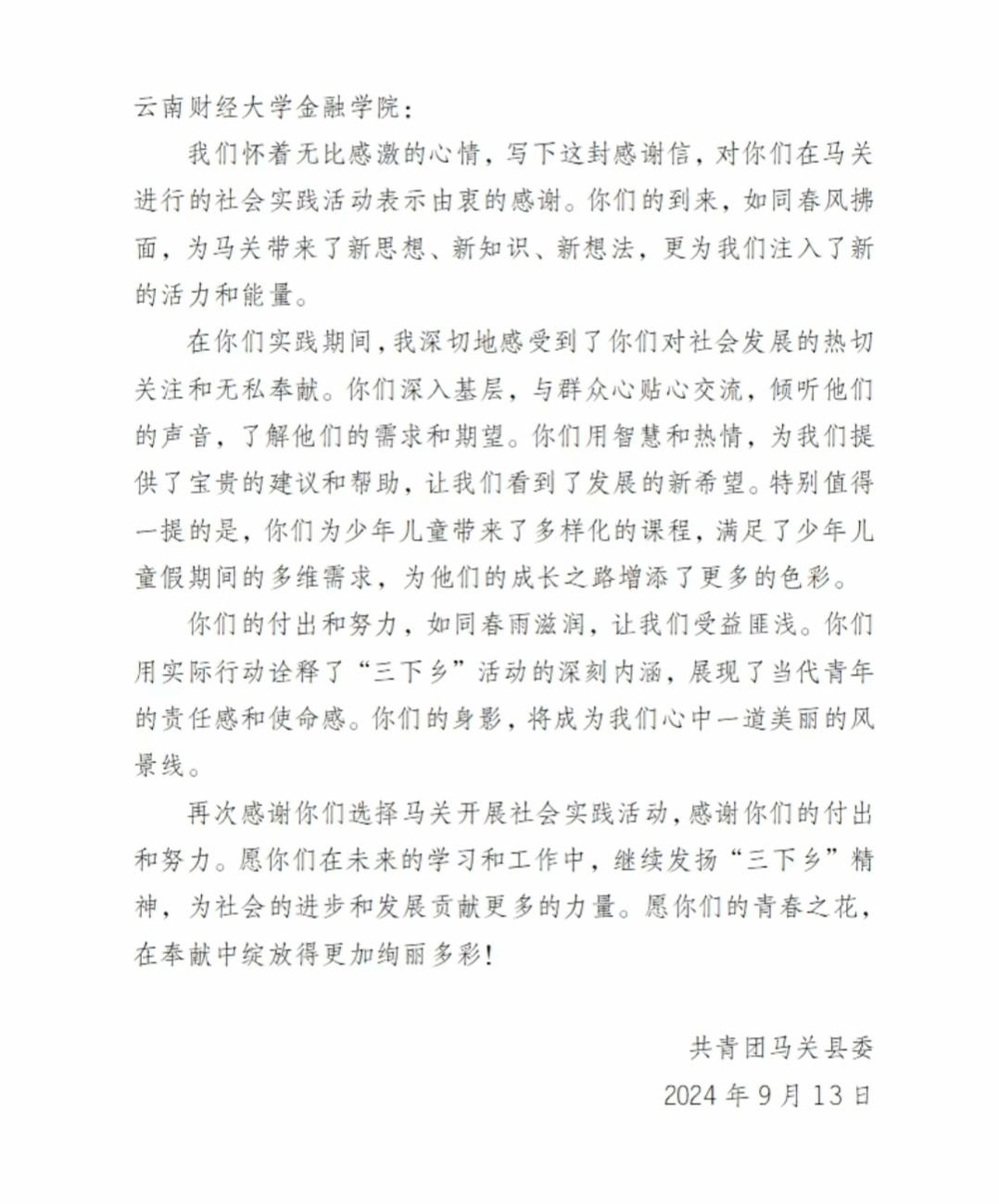信中提到,在“三下乡”实践期间,云南财经大学金融学院实践团队的成员们以饱满的热情、积极的态度、扎实的专业知识,深入基层,走进课堂。认真负责、耐心细致,圆满地完成了各项实践任务。特别提到,在金融小院为少年儿童带来多元化的课程,满足少年儿童假期间的多维需求,充分展现了出色的团队协作能力和良好的专业素养,为马关县的发展贡献自己的一份力量。