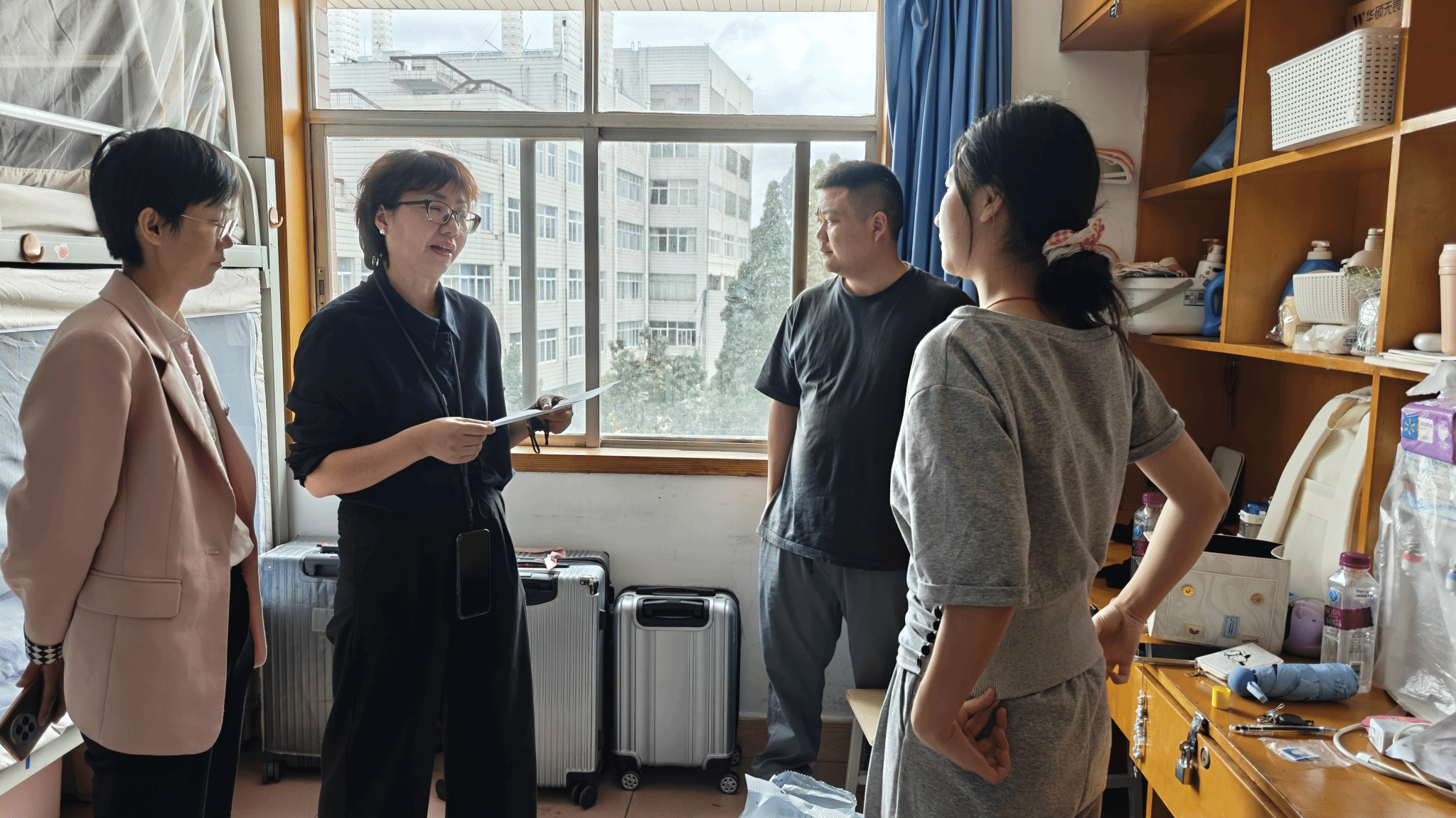 2025年8月28日,金融学院党委书记胡小珊、副书记郭丽仙、辅导员赵超朋等一行走访2025级新生宿舍,了解学生入住情况并进行安全卫生检查。