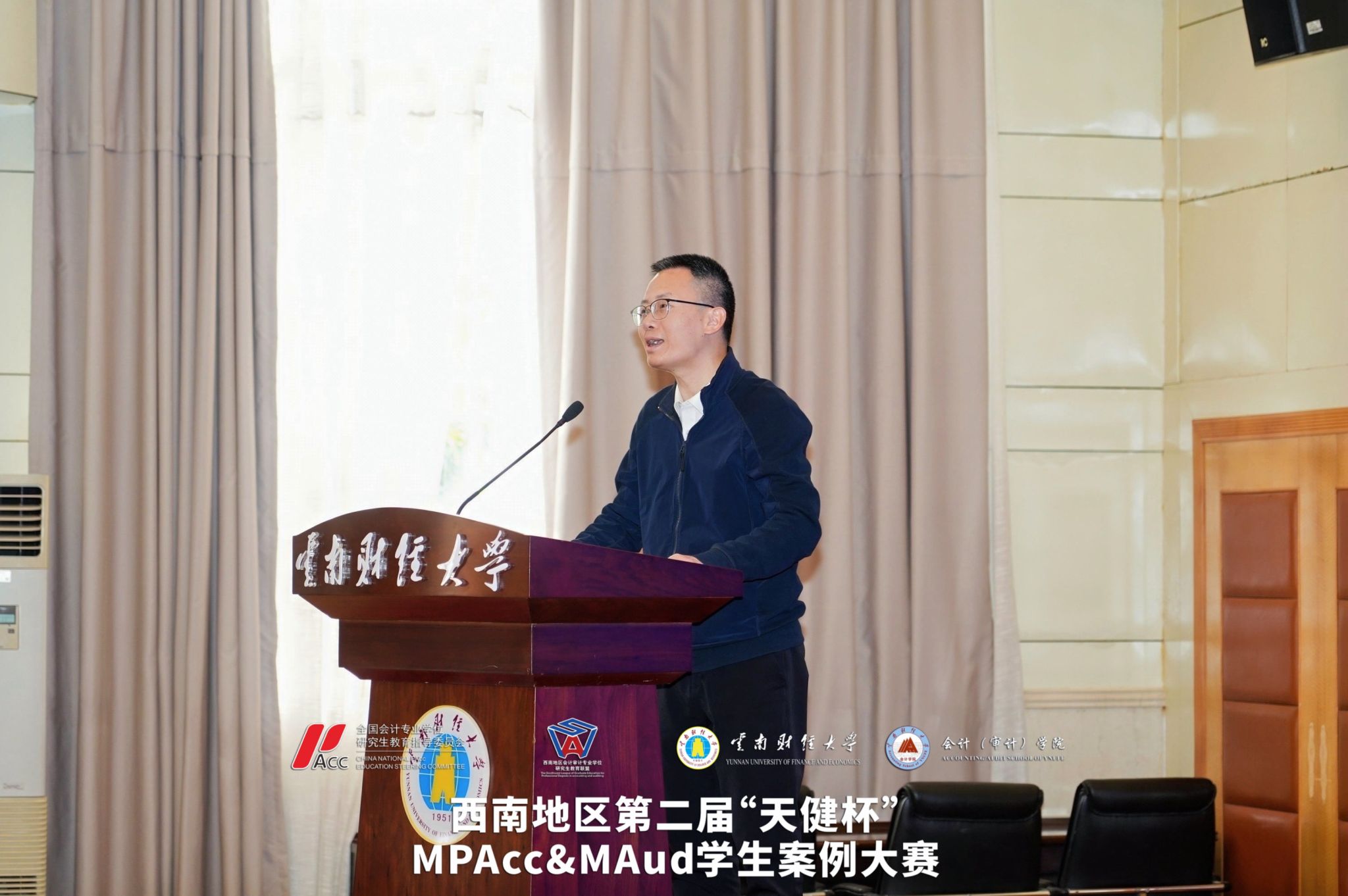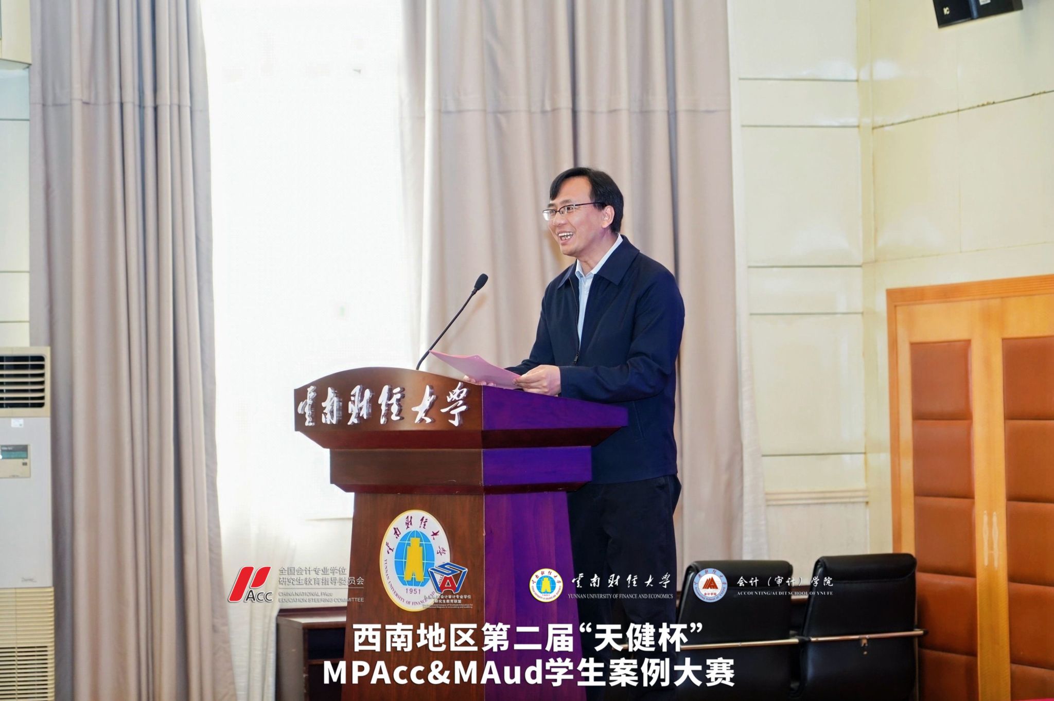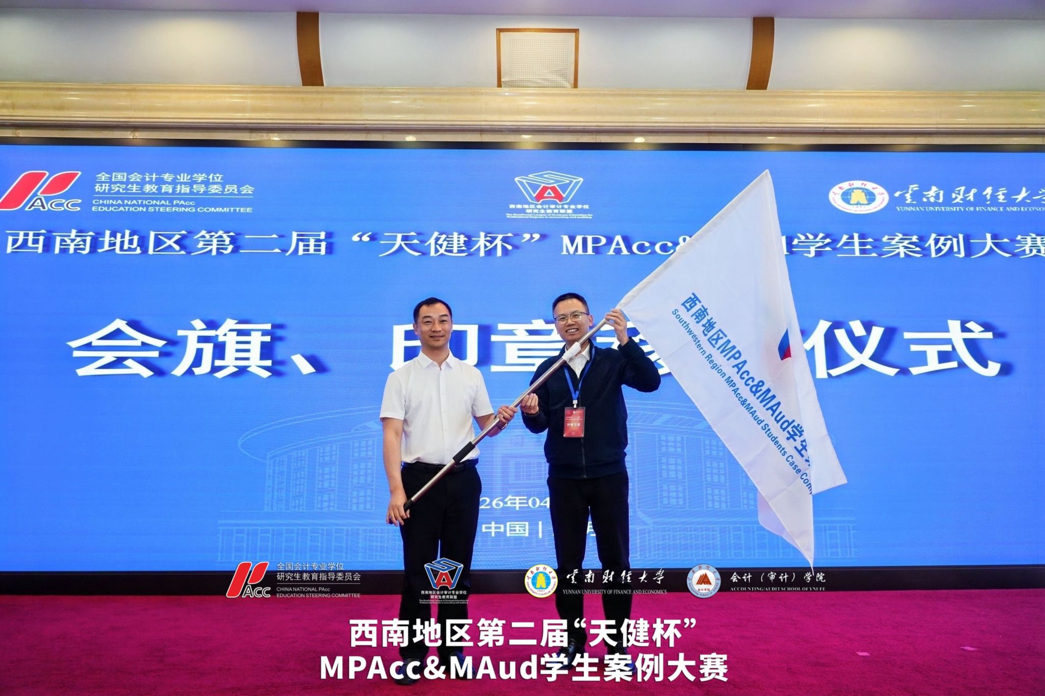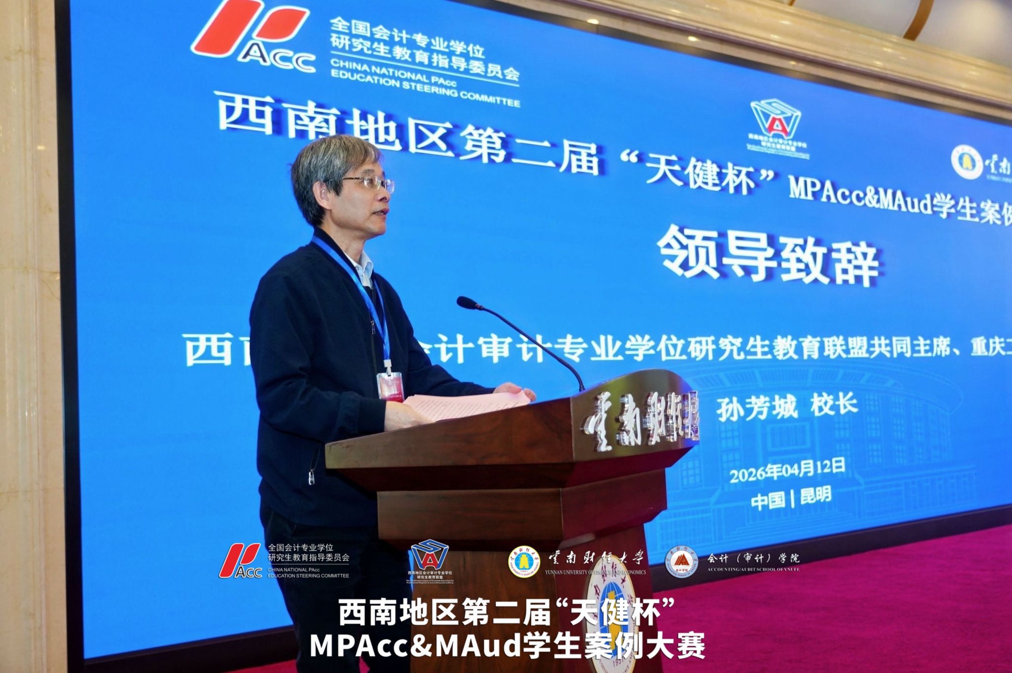2026年4月11日至12日,西南地区第二届“天健杯”MPAcc&MAud学生案例大赛在我校落下帷幕。西南地区会计审计专业学位研究生教育联盟共同主席、重庆工商大学原校长孙芳城教授,贵州财经大学副校长杜剑教授,云南财经大学副校长余怒涛教授,全国MPACC教指委委员、西安交通大学汪方军教授,西南地区会计审计专业学位研究生教育联盟秘书长、西南财经大学会计学院院长唐雪松教授,云南省教育厅学位管理与研究生教育处处长司慧迎女士,天健会计师事务所云南分所高级合伙人、总经理左翔先生等出席决赛现场。研究生院院长纳超洪教授主持开幕式。