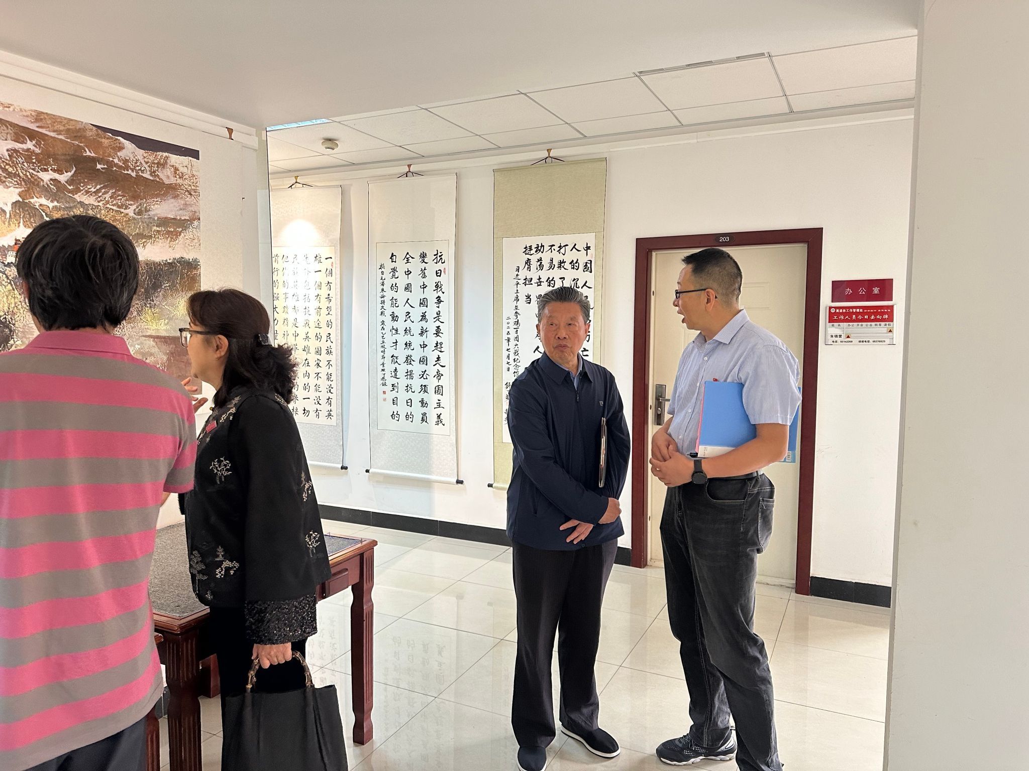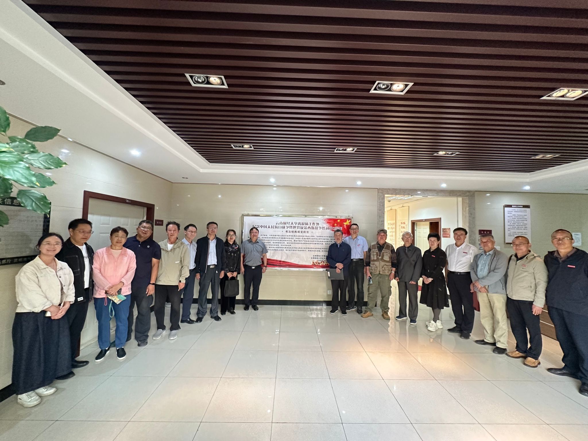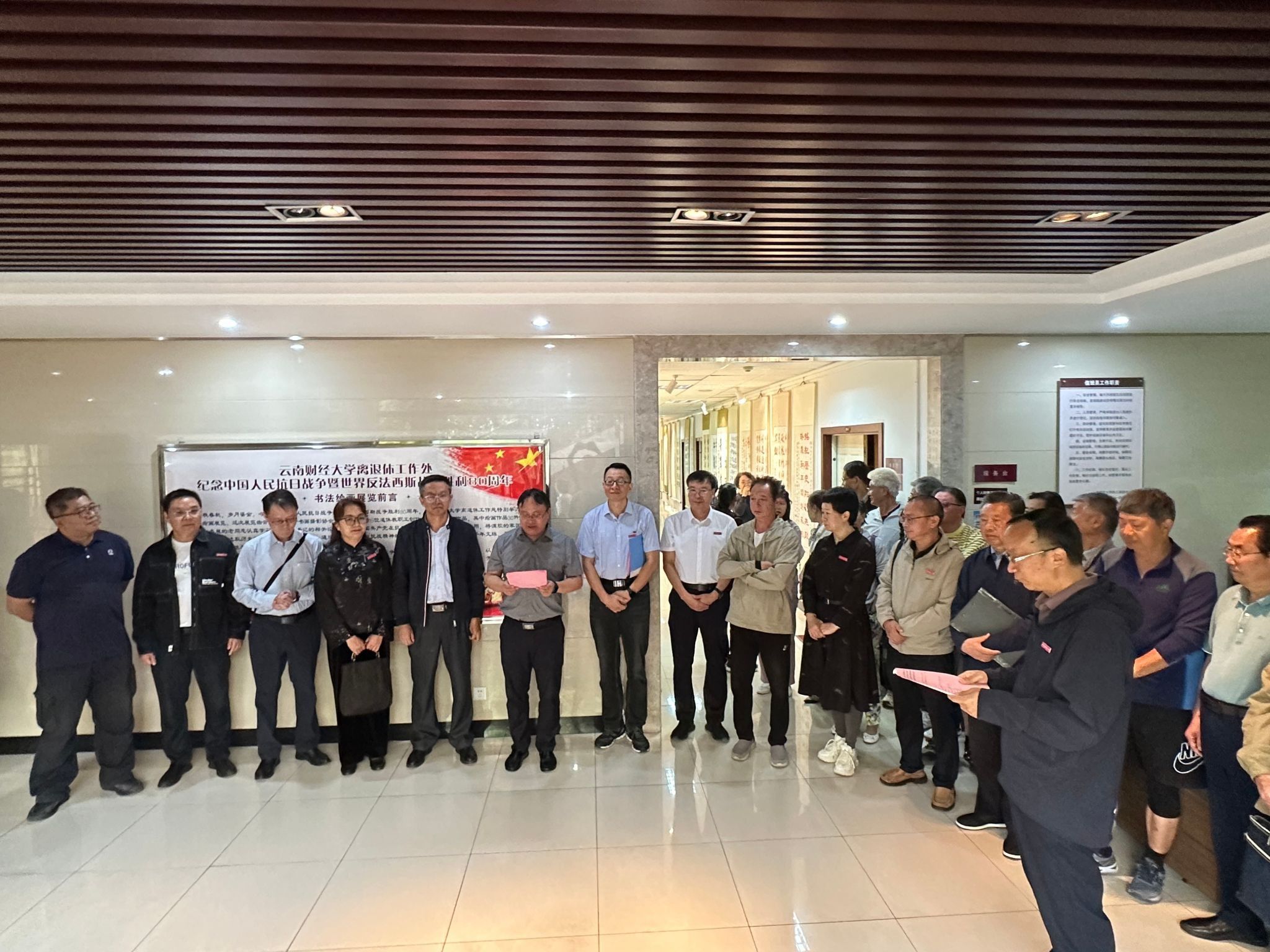 2025年9月25日10时,学校在龙泉校区南院游泳馆二楼职工活动中心举办“纪念中国人民抗日战争暨世界反法西斯战争胜利80周年”书法绘画展开展仪式。学校党委委员、副校长颜明出席仪式,学校离退休工作领导小组成员单位负责人、云财老年书画摄影协会会长童映河及部分离退休职工参加仪式,仪式由离退休人员党委副书记王俊主持。
