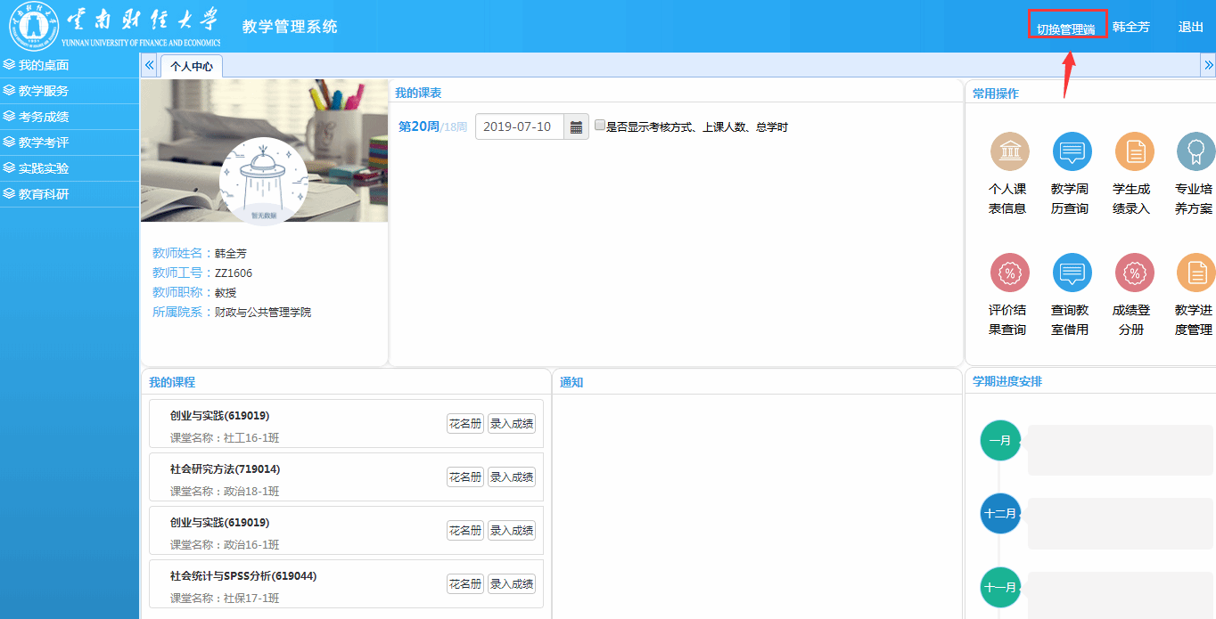 第三步:由于我们属于教学院长角色,同时属于老师也属于管理员,那么我们需要进行切换用户类型。