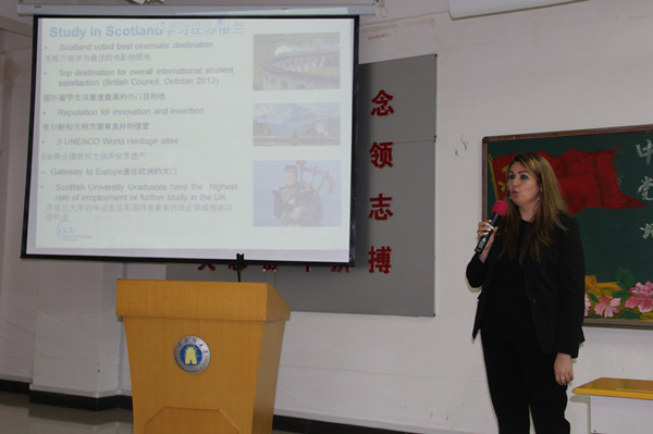 Susan McGiffen介绍了格拉斯哥喀里多尼亚大学的师生人数、办学历史、教育理念、专业设置、校区及海外分校等基本情况,并着重介绍了与中国高校的合作及全球教育项目。她希望两校能够从开展夏令营等短期交流项目开始,不断深化双方的合作。
