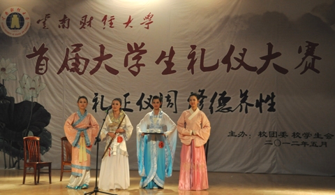 5月17日,由校团委、学生会主办的云南财经大学第六届校园文化艺术节、2012年“德行校园”系列活动之首届大学生礼仪大赛决赛在汇新礼堂举行。会计学院乔倩同学获得金奖。