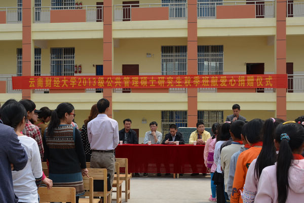 公共管理学院2013级MPA秋季班临时党支部书记赵作让代表师生发言,勉励鸡头村小学的学生树立远大目标,好好学习,考上包括云南财经大学在内的理想大学,成为对社会有用的人。发言结束后,赵作让将一万元善款交给了鸡头村小学的校长,并举行了学生餐具柜交付仪式。活动在鸡头村小学全体师生的掌声和感谢声中结束。