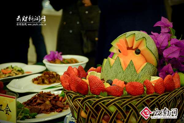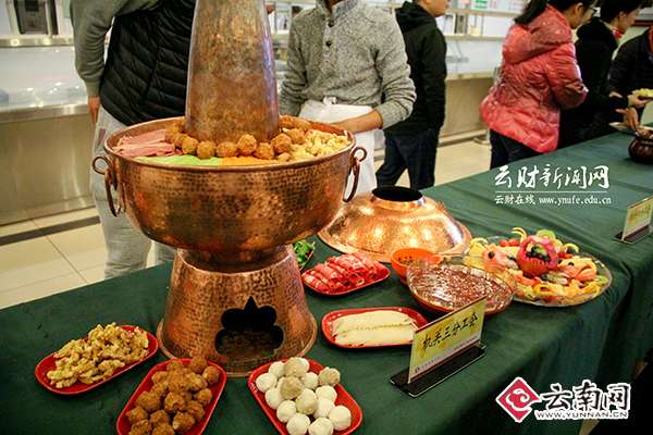 老师们纷纷展示了自己的拿手菜,南北融合,地域色彩突出。有滇味浓厚的“滇式炊锅”,鲜香麻辣,寓意团团圆圆、红红火火;有湖北名菜“豆豉鱼”,色泽棕红,细嫩香美,咸鲜适口;有川菜经典“东坡肘子”,肥而不腻,熟而不烂,色香味形俱佳;有河南小吃“菜蟒”、“胡辣汤”,浓郁扑鼻、回味无穷;有新疆少数民族特色的“羊肉抓饭”,剔透饭粒包裹着爽口羊肉,散发出浓浓的肉香;还有五彩缤纷的水果拼盘“花果飘香”,满含花之浓郁、果之清香。 “看我的‘乾坤大挪移’。”来自校长办公室的耿齐航老师正在精心准备做狮子头的肉馅,一边说一遍奋力地搅拌。各分工会都为比赛费劲心思,妙招百出。“我们下午1点多就过来准备了,还自备了大炊锅给大家一个惊喜。”保卫处的老师介绍说。