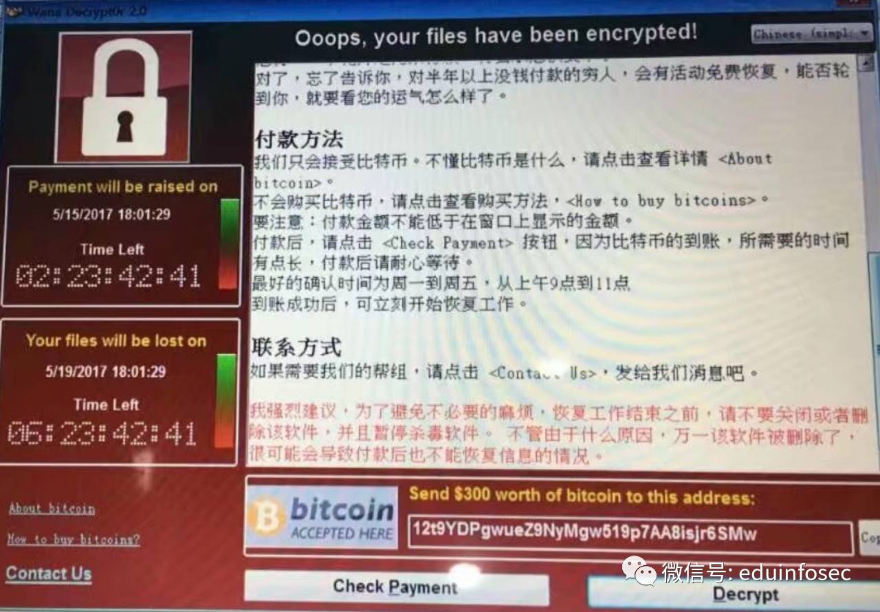 北京时间2017年5月12日20时左右,全球爆发大规模勒索软件感染事件,我国大量行业企业内网大规模感染,教育网受损严重,攻击造成了教学系统瘫痪,甚至包括校园一卡通系统。该勒索软件是一个名称为“wannacry”的新家族,该勒索病毒一旦运行会对所有系统文件进行加密,目前无法解密该勒索软件加密的文件。