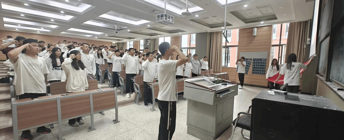 会上,信息学院分团委学生副书记赵秋墁,李雅婷,黎可晶,罗吉泽,王永智依次上台为23位新发展团员佩戴团徽。熠熠生辉的团徽不仅是荣誉的象征,更承载着中国共产主义青年团对青年一代的殷切期望。随后,在领誓人杨丰硕的带领下,新团员面向团旗进行庄严宣誓,铮铮誓言铿锵有力,回荡在教室的每一个角落,展现出新团员们为共产主义事业而奋斗的坚定决心。宣誓完毕后,现场团员们共同重温入团誓词,以初心唤醒使命,以誓言砥砺担当,进一步增强了全体团员对团组织的责任使命感。