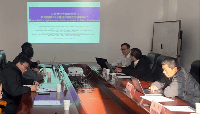 2025年12月14日上午,北京大学李挥教授应邀在云南财经大学信息中心302-1会议室举办“如何构建RWA及稳定币的高安全网络平台?”专题讲座。该讲座由云南财经大学信息学院(智能应用研究院)主办,信息学院副院长付涛主持。文山州发改委副主任兼数据局局长太竞辉、云南省设计院集团数字技术有限公司副总经理徐伶等校外嘉宾,以及信息学院余益民教授、冯涛教授、吴圣尧老师与学院学生代表共同参加了讲座。