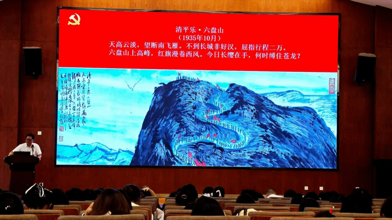 张国政以《毛泽东诗词人生》为题,通过生动的讲解和深情的朗诵,围绕“长征时期-红军不怕远征难”“抗日战争时期-外侮需人御”两个时期的诗词作品,从《忆秦娥娄山关》讲到《沁园春·雪》,诗词、书法与历史事件相互映照,带领全场师生真切地感受了毛泽东诗词中的革命精神、坚定信仰和豪迈气概,以喜闻乐见的方式重温和体悟了长征精神和抗战精神。