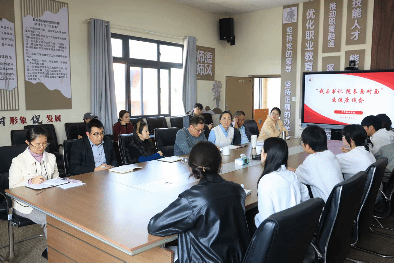 11月7日下午,中华职业学院在安宁校区修远512会议室举办“我与书记院长面对面”交流座谈会。学院领导班子成员和科室负责人、各年级代表参加座谈。座谈会由学院团委老师马铭悠主持。