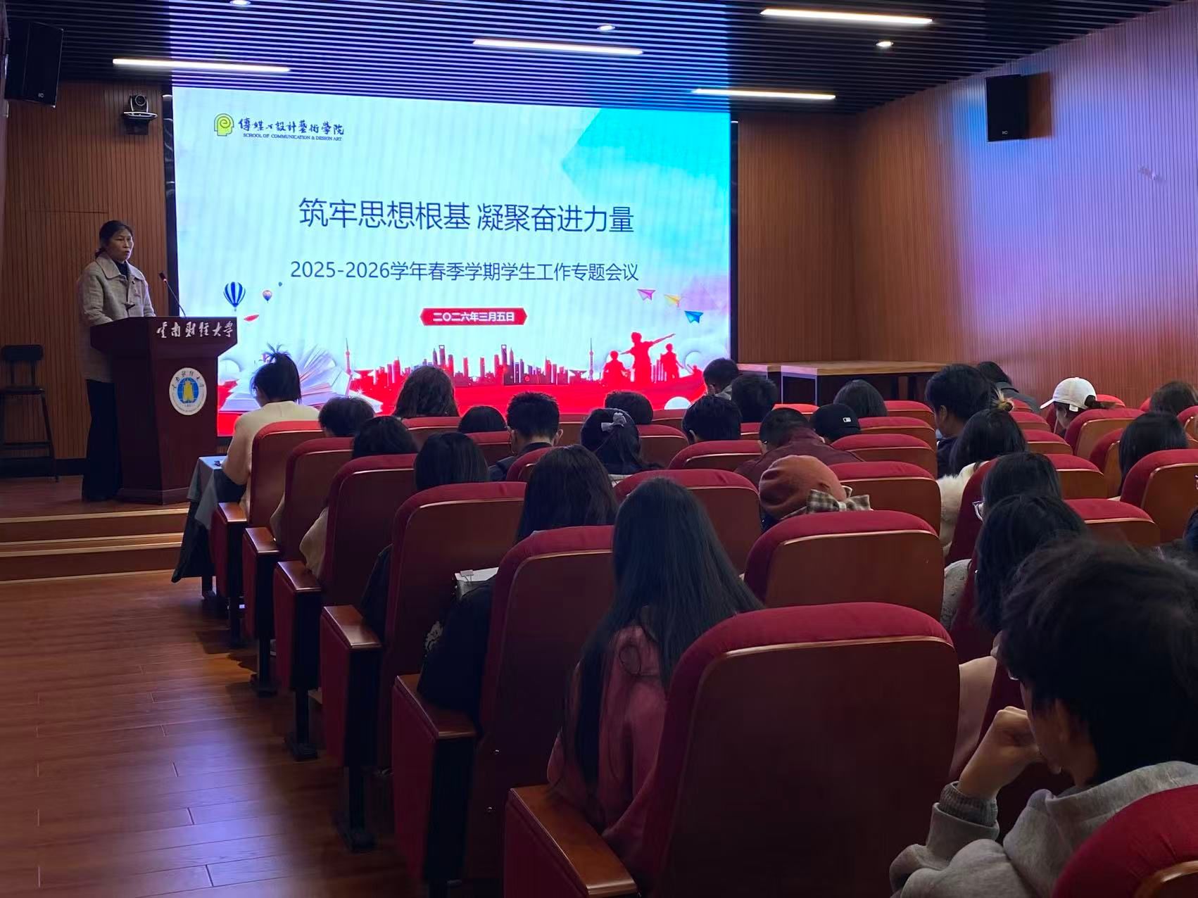 为深入贯彻落实学校安全工作会议精神,进一步压紧压实校园安全稳定责任,强化班干部示范引领作用,近日,传媒与设计艺术学院在齐远楼106报告厅举行春季学期学生工作专题会议暨开学第一课。