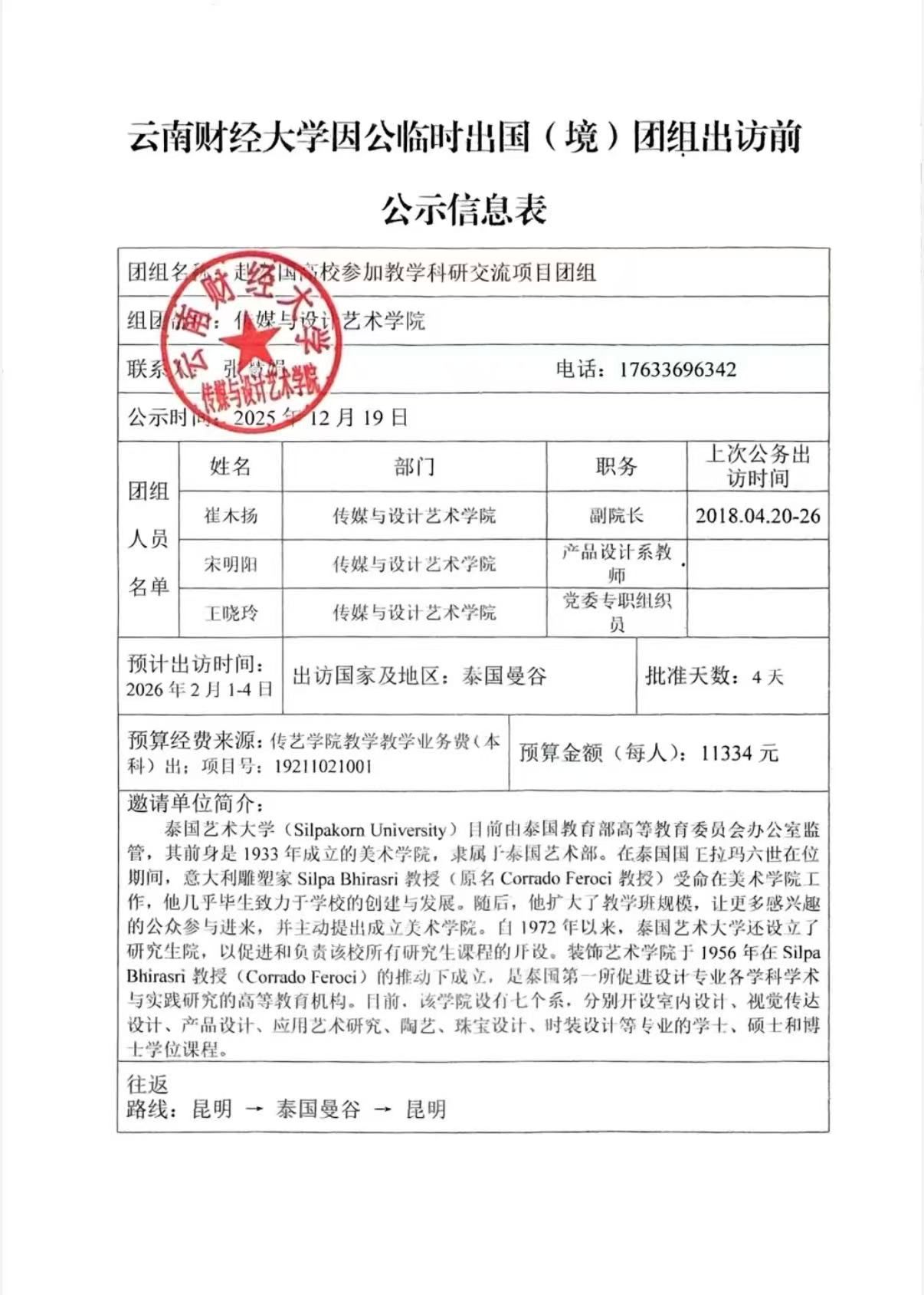 云南财经大学因公临时出国(境)组团出访前公示信息表