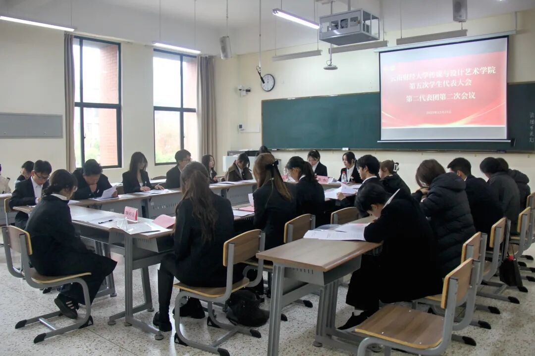 2025年12月23日,云南财经大学传媒与设计艺术学院第五次学生代表大会于安宁校区齐远楼106报告厅顺利召开,学院党委书记张波、党委副书记赵小玎、团委书记谢天娇,校学生会主席团成员伊凡,院第四届学生会主席团成员王智岚、胡敏出席开幕式,全院48名学生代表参会。