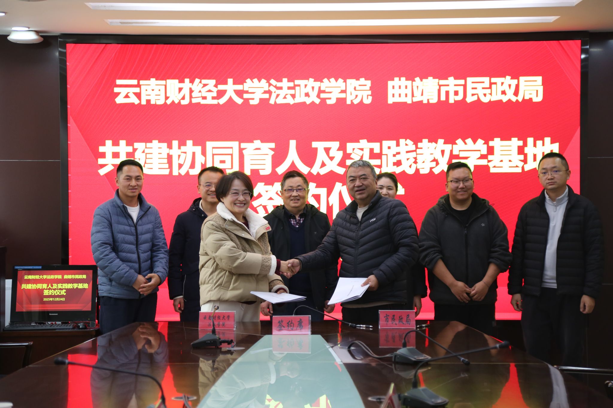 为积极响应新时代社会工作人才培养与社会治理创新的双重需求,推动高校教育资源与地方民政实践深度融合,2025年12月24日,云南财经大学法政学院与曲靖市民政局成功举行协同育人及实践教学基地共建座谈会暨合作协议签署仪式。双方围绕实务教学、科研合作、服务提升等核心议题展开深入交流,共同开启了校地合作共育专业人才、服务地方发展的新篇章。