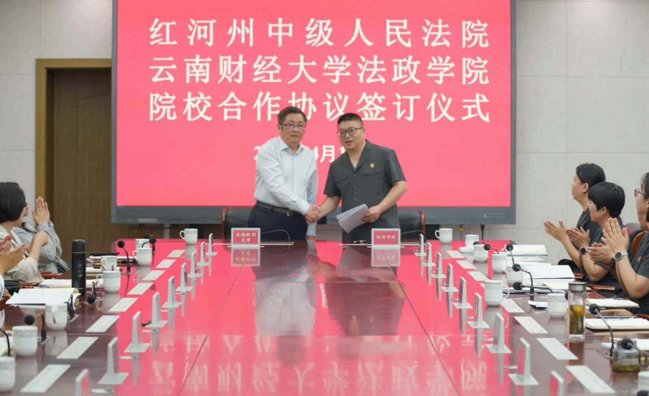 为推动法学理论与司法实务深度融合,助力边疆民族地区法治人才培养与司法调研提质增效,2026年4月10日,云南财经大学法政学院与红河州中级人民法院举行院校合作签约仪式,开启理论与实践协同发展新篇章。云南财经大学法政学院院长石现明、红河中院党组书记、院长李祖发出席仪式。红河中院党组副书记、常务副院长唐时华主持仪式。