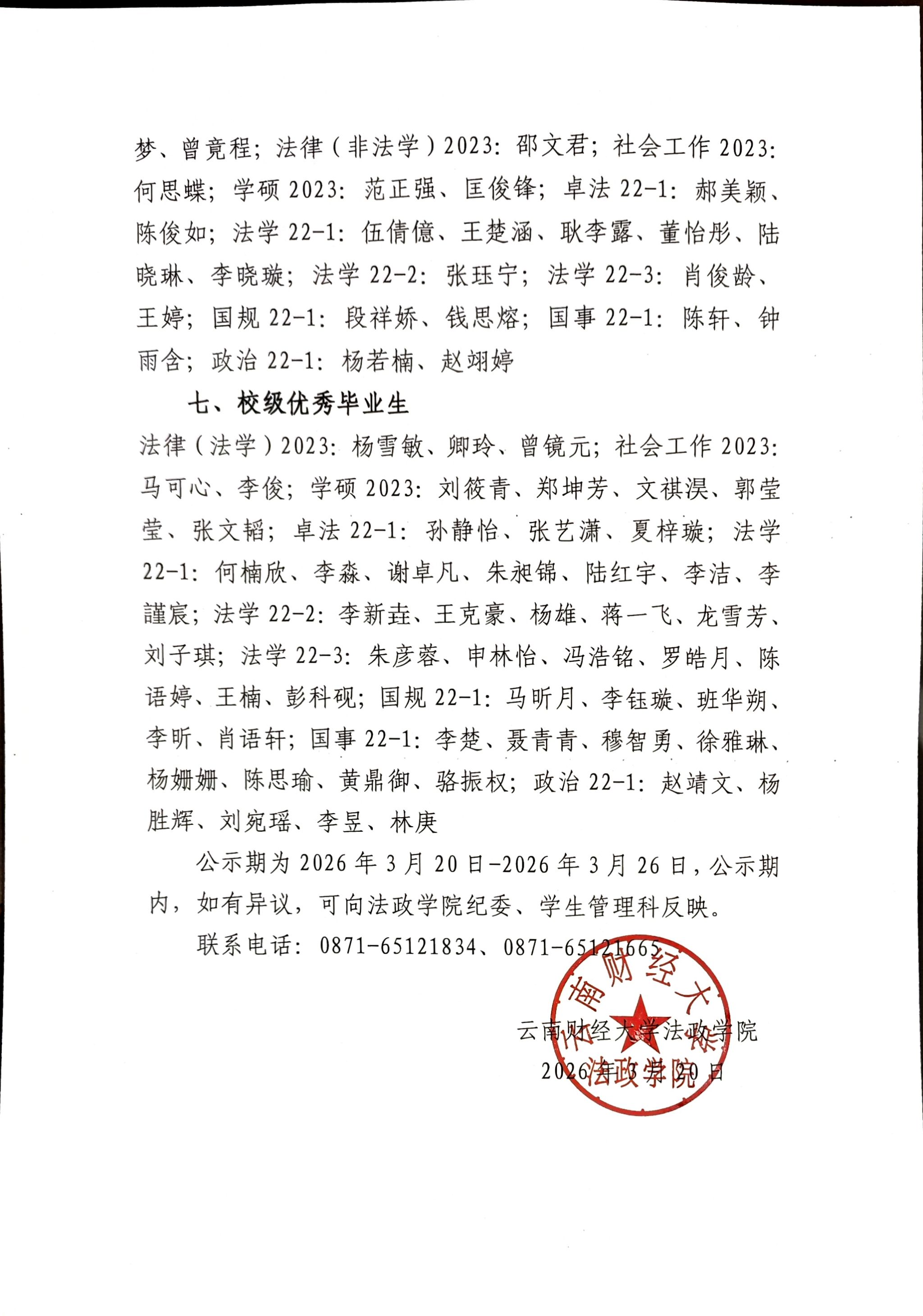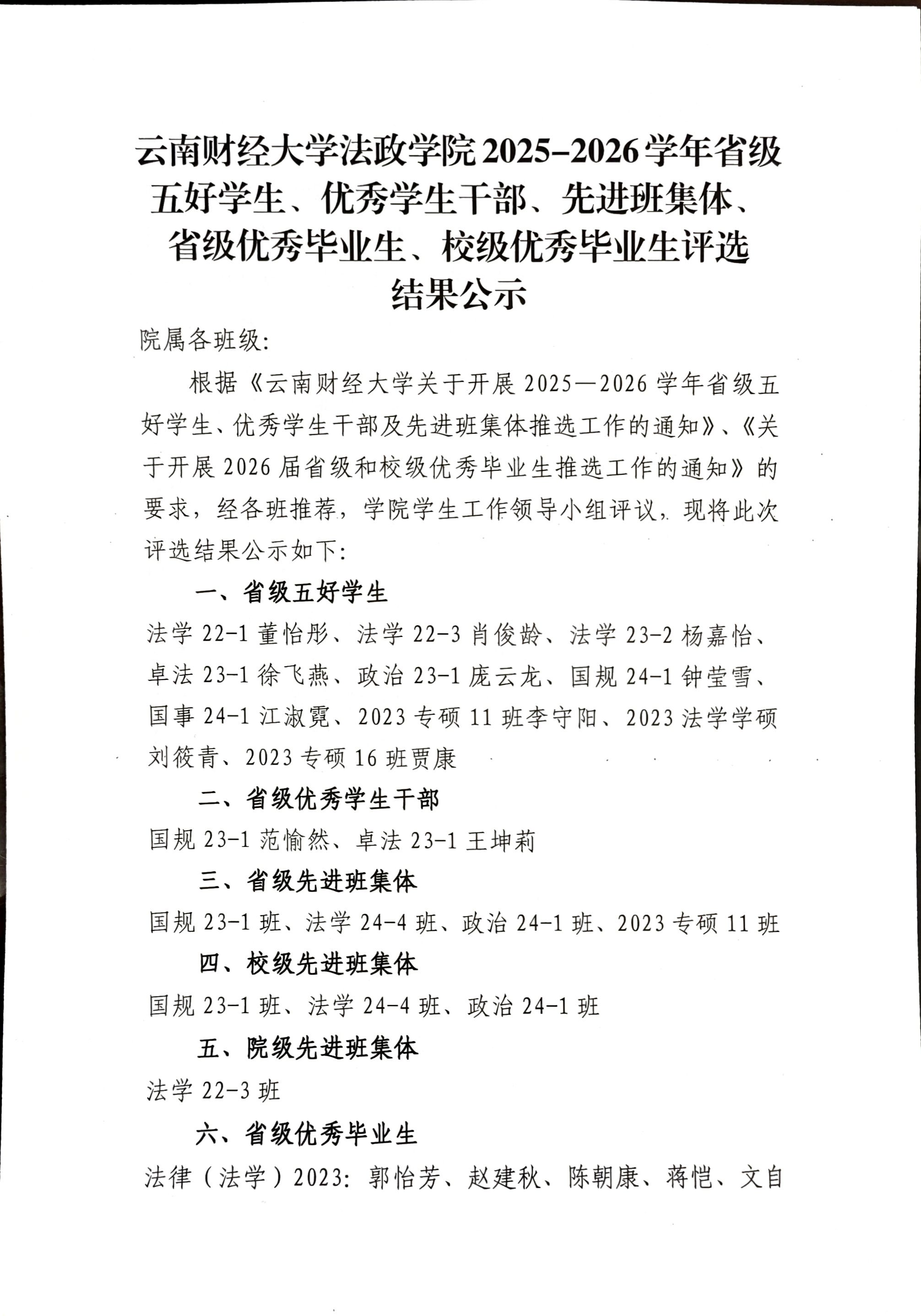 云南财经大学法政学院2025-2026学年省级五好学生、优秀学生干部、先进班集体、省级优秀毕业生、校级优秀毕业生评选结果公示
