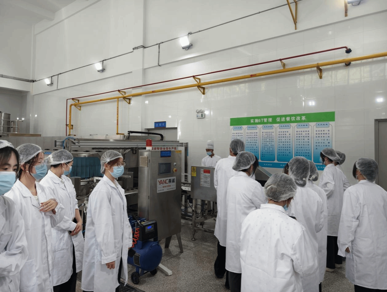 参观交流阶段,工作人员引导学生代表走进北院米饭生产车间和英华餐厅,实地参观米饭生产线及餐厅后厨、食材储存区、消毒区、采购验收区等重要区域,沉浸式了解标准化米饭生产流程与全链条食安管控体系。