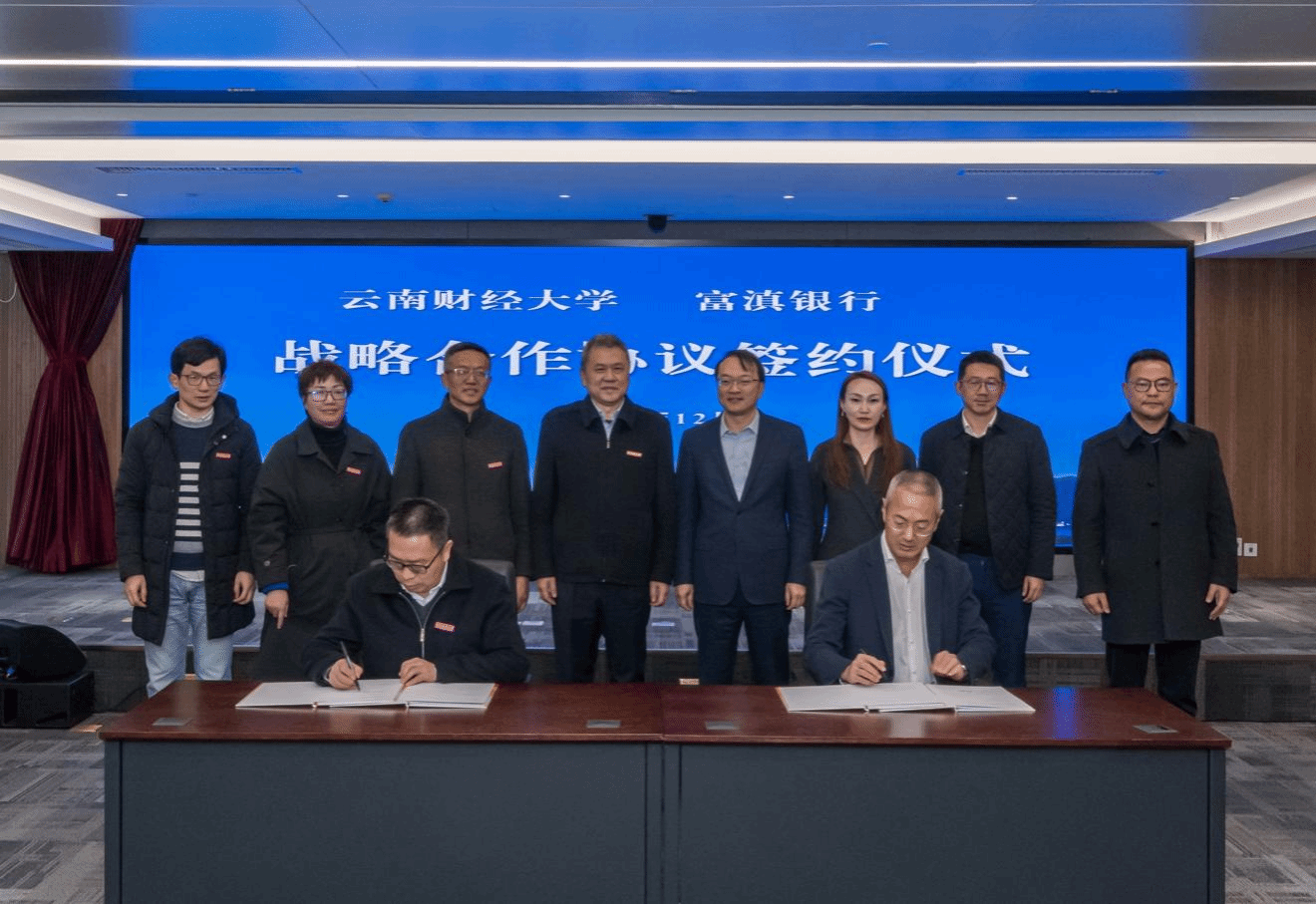 彭强与纳然分别代表双方签署战略合作协议。会前,学校一行参观了富滇银行历史陈列馆、资金交易中心和数字中心。