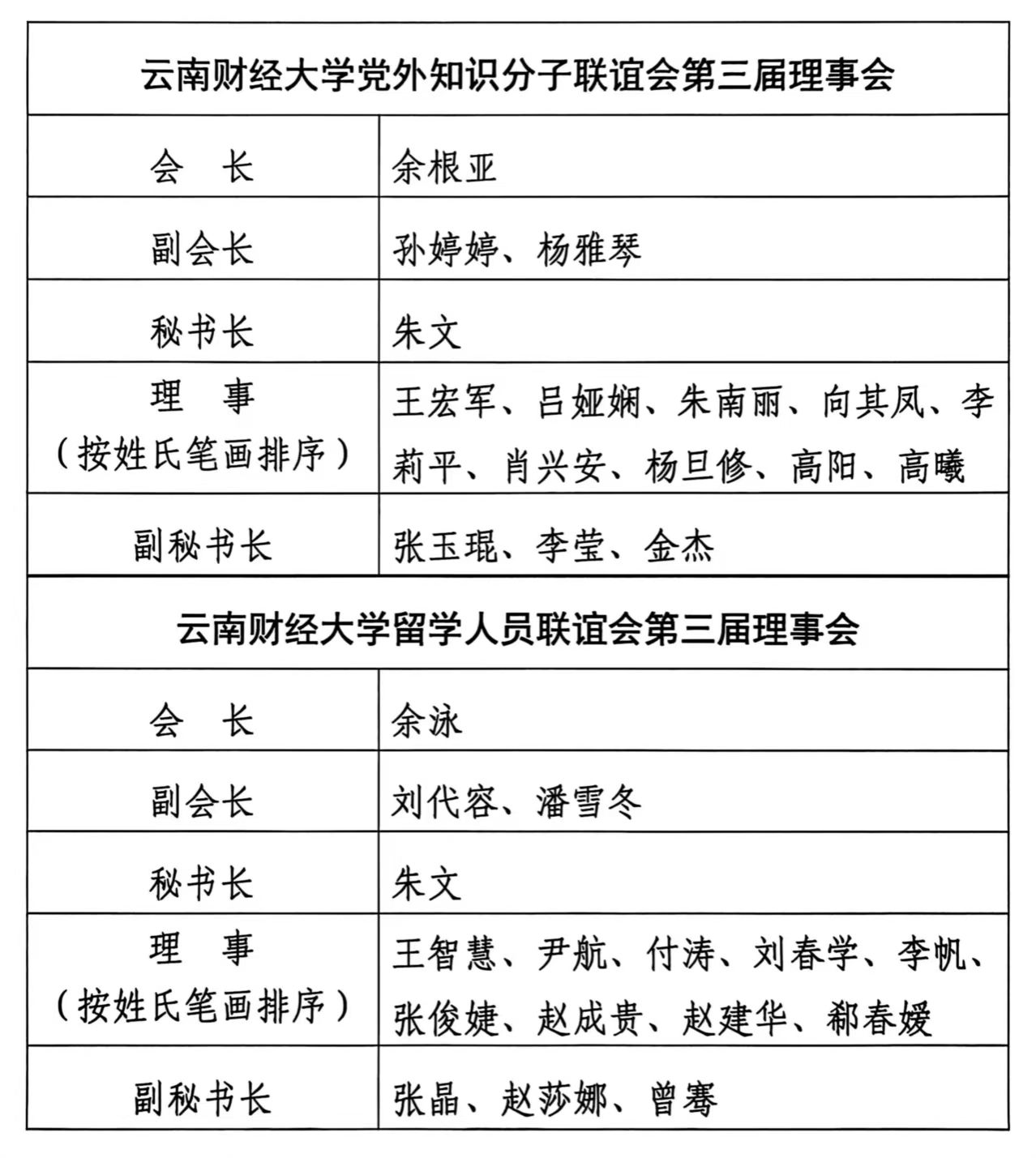 大会听取了学校党外知识分子联谊会第二届理事会、留学人员联谊会第二届理事会工作报告及两个联谊会章程修订说明,审议通过了《云南财经大学党外知识分子联谊会章程(修订稿)》《云南财经大学留学人员联谊会章程(修订稿)》,选举产生了学校党外知识分子联谊会、留学人员联谊会第三届理事会理事。