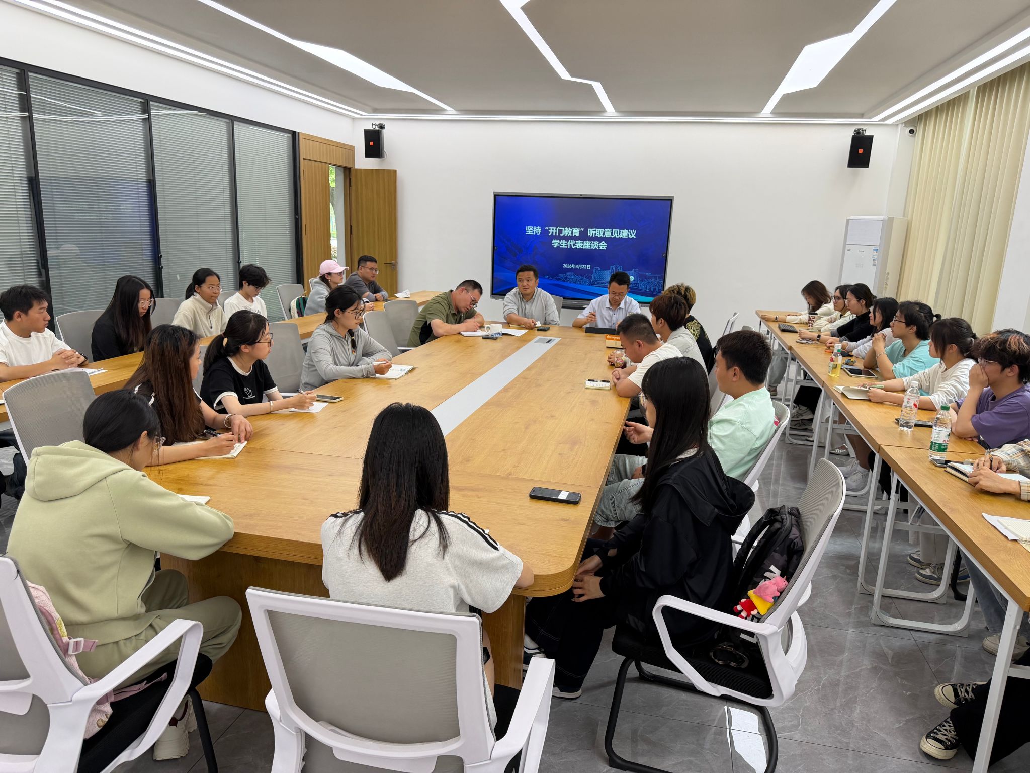 为推动树立和践行正确政绩观学习教育入脑入心见行见效,4月22日下午,学校在云彩“一站式”学生中心召开“开门教育”学生座谈会,广泛深入听取同学们对学校改革发展的意见建议。学生处处长沙磊、校团委书记舒挺、学生服务中心专职副主任王帅,以及相关科室负责人、校学生会和研究生会代表、各学院学生代表30余人参加座谈。