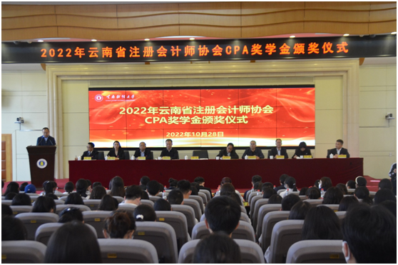 10月28日,2022年度云南省注册会计师协会CPA奖学金颁奖仪式在云南财经大学举行,云南省财政厅党组成员、副厅长、厅社会组织党委书记王武,云南省财政厅总会计师、二级巡视员赵建森,云南财经大学党委委员、副校长余怒涛,云南省注册会计师协会负责人出席会议,云南省财政厅会计处,云南财经大学校友工作办公室、教育发展基金会,会计学院及各参评学院的负责人和相关同志及获得2022年度CPA奖学金的全体师生参加颁奖仪式。颁奖仪式由云南财经大学副校长彭强主持。