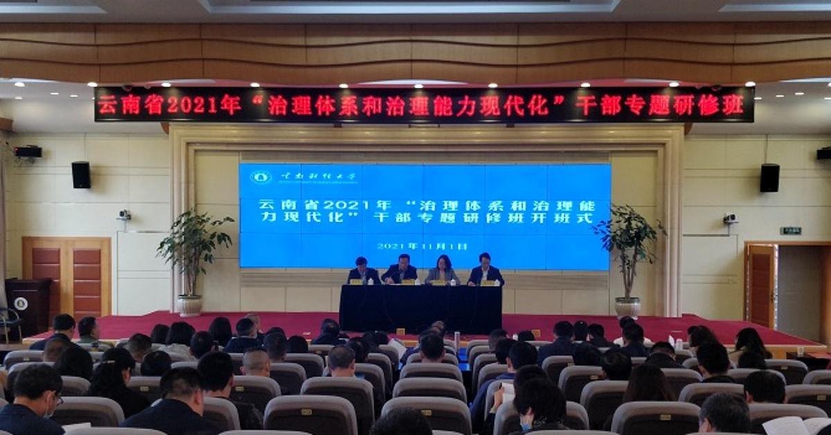 为深入学习贯彻习近平总书记在庆祝中国共产党成立100周年大会上的重要讲话精神和考察云南重要讲话精神,围绕云南省“十四五”规划,提高干部管理水平,11月1日至11月5日,由中共云南省委组织部主办,云南财经大学承办的云南省2021年“治理体系和治理能力现代化”干部专题研修班在凌云楼北附201国际学术报告厅举行。开班仪式上,省委组织部干部教育处一级主任科员和颖欣作动员讲话,学校党委副书记桂正华致辞,组织部部长、党校执行副校长吴应利作学风纪律教育。开班式由党校办公室主任朱尤忠主持。