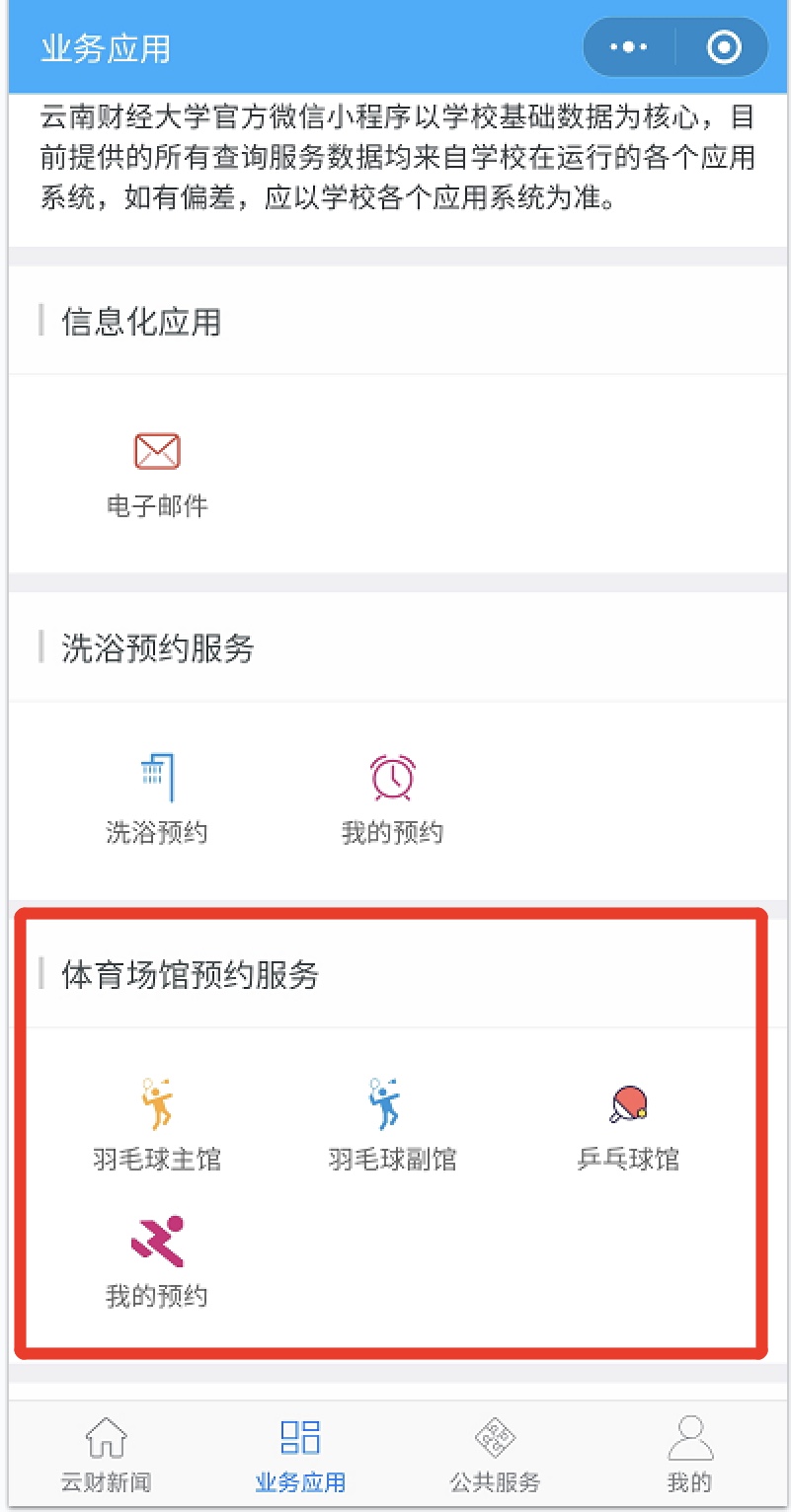 第二步,进入“业务应用”页面,查看可预约的体育场馆,如下图所示: