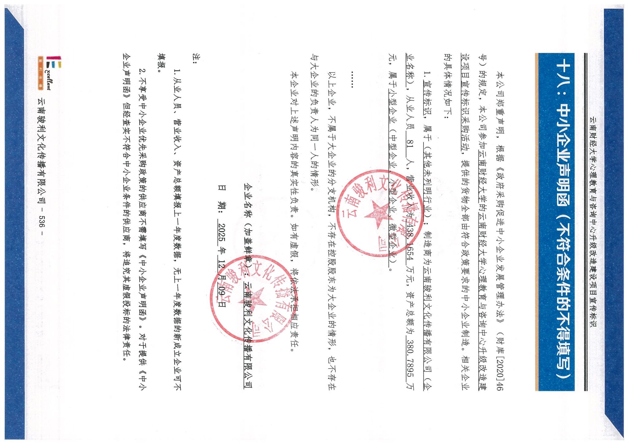 名称:云南财经大学心理教育与咨询中心升级改造建设项目宣传标识 服务范围:本次采购的文化墙旨在将心理咨询室的核心理念视觉化、氛围化,打造一个积极、温暖、启发式的环境,使其成为心理健康教育的无声阵地。具体需实现以下功能与目标: ①普及心理健康知识:以生动有趣的形式介绍常见的心理现象(如情绪、压力)、心理调适技巧(如深呼吸法、积极暗示)、心理健康标准等,提升学生的心理素养。 ②介绍服务资源:清晰展示开放时间、预约方式、心理咨询师简介等,引导学生有效利用资源。 ③环境营造功能:营造安全与接纳的氛围 ④色彩与设计:整体设计应运用温暖、柔和、平静的色彩(如淡绿、米黄),避免强烈刺激。 ⑤内容亲和力:文字内容应使用鼓励性、邀请性、非说教式的语言(如“你的感受很重要”、“在这里,有人愿意听你说”),营造一种被接纳、被理解的安全感。 ⑥互动与参与功能:增强学生参与感 ⑦设计互动区域:可设置便签墙、心情涂鸦板、趣味问答转盘等互动区域,鼓励学生表达情感、分享感悟,使文化墙从“可看”变为“可参与”。 ⑧展示学生作品:可设计区域用于展示学生在心理健康活动月、团体辅导后创作的作品(如绘画、文章),增强归属感和成就感。 ⑨美学与专业功能:与整体环境协调统一。 服务要求: 1.总体目标与定位 本次采购的文化墙旨在为学校心理咨询中心(或心理辅导室)营造一个温馨、安全、积极、专业的视觉环境与文化氛围。其核心功能是: 宣传教育功能:普及心理健康知识,介绍服务资源,消除心理病耻感。 情绪安抚功能:通过色彩、图案和文字,为来访者提供视觉上的放松与慰藉。 引导互动功能:引导学生关注自我心理状态,并鼓励其在需要时主动寻求帮助。 环境美化功能:与室内整体装修风格协调,提升空间的专业品质与美感。 2核心要求细则 (一) 质量要求 设计质量: 专业性:内容必须科学、准确,符合青少年心理发展规律,由专业心理咨询师或相关领域专家审核。 艺术性:设计风格应现代、简洁、温馨,避免幼稚化或过于严肃。构图美观,色彩协调,具有视觉吸引力。 材料与工艺质量: 主材耐用性:所使用的板材(如KT板、雪弗板、亚克力、金属等)、布料、涂料等必须符合国家环保标准,无异味、不变形、不易破损。 印刷质量:画面打印精度高,分辨率不低于300dpi,色彩还原真实、饱满,无色差、无晕染、无颗粒感。 制作工艺: 边角处理:所有边角必须进行圆角化处理或采用柔软材质包裹,杜绝尖锐直角,防止磕碰。 表面处理:表面应覆膜或进行抗紫外线处理,具备防刮、防水、防潮、易清洁的特性。 安装结构:安装部件(如挂钩、背板、支架)应坚固可靠,确保上墙后平整、稳固、无翘边。 (二) 安全要求 物理安全: 结构稳固:整体安装必须牢固,能承受轻微的意外碰撞,无倾倒、脱落风险。 防火阻燃:主要材料应达到国家B1级或以上难燃等级,降低火灾风险。 环保无害:所有材料需提供环保检测报告,确保甲醛、苯系物等有害物质释放量符合GB 18580-2017等国家强制性标准,保障师生健康。 无锐利边缘:重申所有外露部分必须无毛刺、无锐角。 心理安全: 内容正向:文字和图像必须传递积极、包容、希望和成长的信号,避免使用可能引发焦虑、恐惧或羞耻的负面暗示。 尊重隐私:设计中不得出现任何可能泄露学生个人隐私的内容或设计。 文化适宜性:内容应符合社会主义核心价值观,并尊重不同学生的文化背景和家庭环境。 (三) 技术规格 尺寸与布局: 供应商需根据我方提供的现场实测尺寸图进行深化设计,并提供最终的版面布局图。 文化墙可能为组合式(如主形象墙+多个功能板块),需明确各部分的尺寸和相对位置。 内容模块(建议包含但不限于): 主题标识区:醒目标注“心理教育与咨询中心”、“心灵港湾”等主题名称。 功能介绍区:清晰介绍开放时间、预约方式、服务内容(个体咨询、团体辅导等)。 心理知识区:如情绪管理、压力应对、人际交往技巧等科普知识。 互动功能区:可设置“心情留言墙”、“心愿树”、“解忧信箱”等可更换、可书写的互动区域。 资源与承诺区:心理咨询师介绍(需征得本人同意)、保密原则承诺、心理援助热线等。 制作工艺标准: 打印技术:采用高精度UV打印或环保弱溶剂墨水打印,保证画面持久如新。 后期制作:精细裁切,无缝拼接(如需拼接),覆哑光膜以减少眩光,保护视力。 (四) 物理特性 形态:平面与立体相结合。主体为平面画面,可适当结合亚克力立体字、软木板、磁性白板等元素,增加层次感和互动性。 质感:整体触感舒适。可选择部分区域使用绒布、软包等柔软材质,增强温馨感和安全性。 色彩:主色调宜采用低饱和度、明快的颜色,如淡蓝色、浅绿色、米黄色等,营造平静放松的氛围。避免使用刺激性过强的高饱和度颜色。 重量:在保证结构稳固的前提下,应尽量控制整体重量,以减轻对墙体的负荷,并便于后续可能的调整。 交货时间:自合同签订生效之日起40日内完成全部建设内容并通过甲方验收。 服务标准:设计服务标准专业性,设计方案需紧密结合学校心理健康教育工作特点,内容科学准确,形式符合学生年龄特征,避免出现任何可能引发焦虑、不适的图文。 定制化:设计师须至少进行 1 次现场勘测,与采购人进行充分沟通。 产品质量标准:所有材料必须符合招标文件部