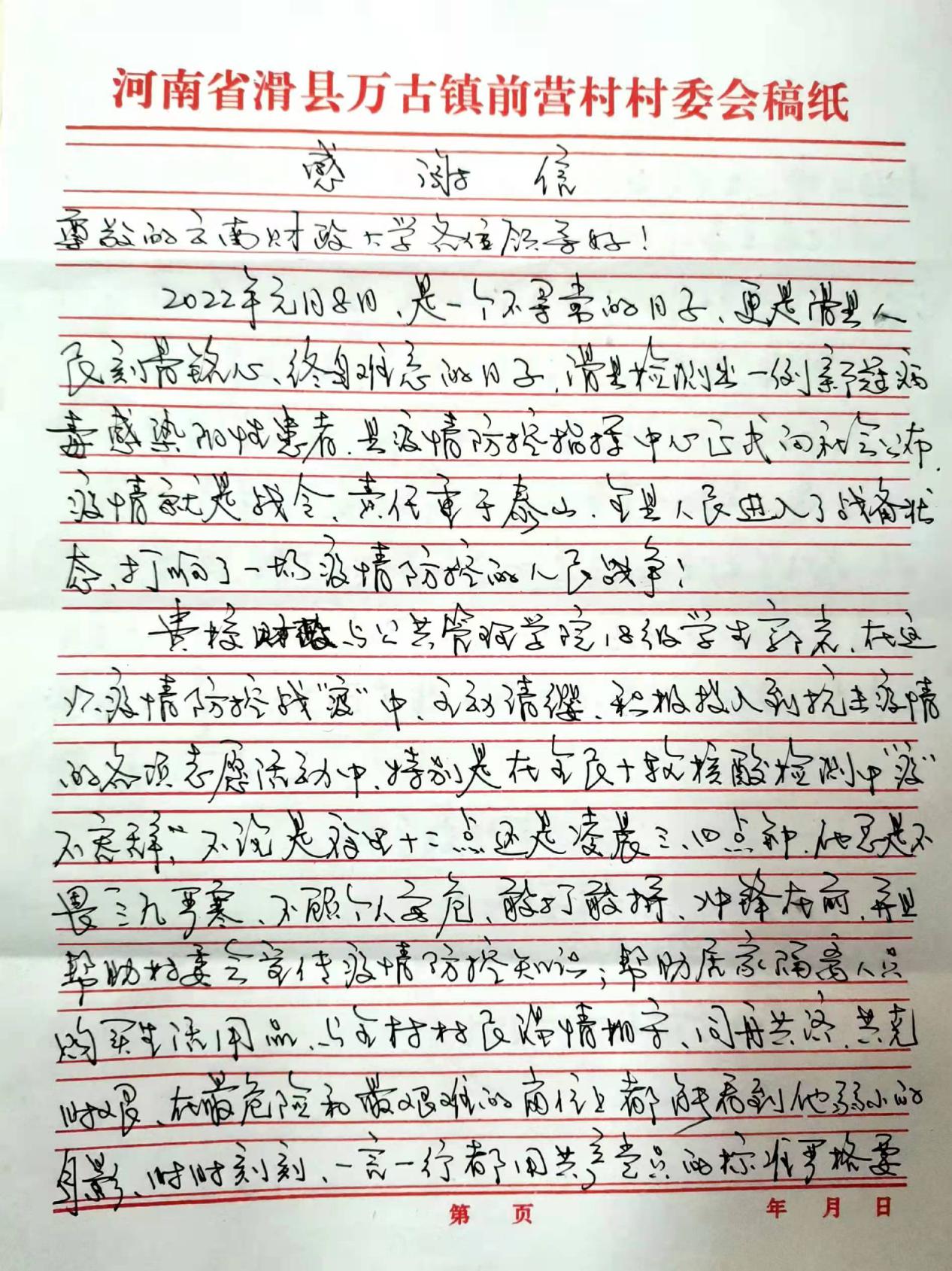 近日,财政与公共管理学院收到来自河南省滑县万古镇前营村党支部、前营村委会寄来的感谢信,对2018级劳动与社会保障专业郭岩同学积极投身万古镇前营村新冠疫情防控工作给予了高度赞扬和肯定,同时表达了对学校和学院教书育人、立德树人成果的极大肯定和由衷感谢。