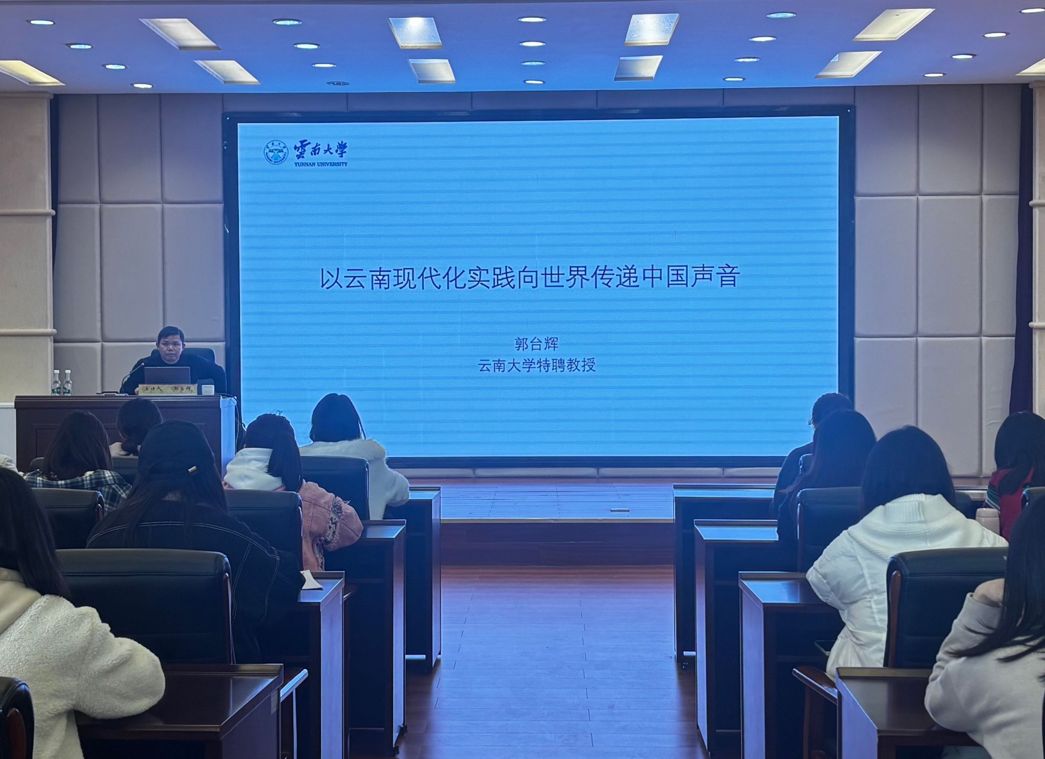 郭台辉围绕“为何传递中国声音”“如何表达中国”“如何提炼云南现代化实践”三个维度展开论述,深入探讨在中国式现代化进程中如何通过云南等多元文化区域的实践经验,构建具有中国特色的发展叙事,向国际社会传递中国式现代化的理论内涵与实践成果。讲座结合丰富案例,对相关理论及研究方法进行了系统阐释。