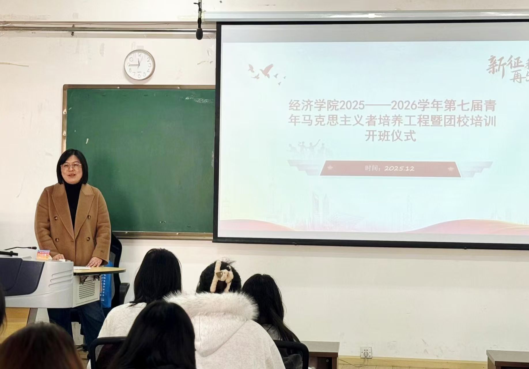 2025年12月30日经济学院在博远楼203教室举行第七届青年马克思主义者培养工程暨团校培训开班仪式仪式由团委负责人幸莹主持,第七届“青马班”全体学员参加。
