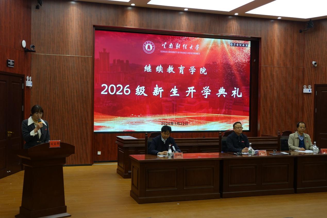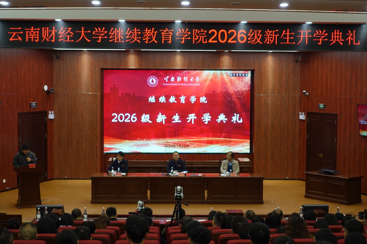 3月22日上午,云南财经大学继续教育学院2026级新生开学典礼在学校北院逸夫楼报告厅隆重举行。校党委委员、副校长颜明,继续教育学院院长胡服、副院长林明辉、学院全体教职工、教学点主要负责人及2026级150余名新生代表出席。胡服主持开学典礼,分两个阶段进行。