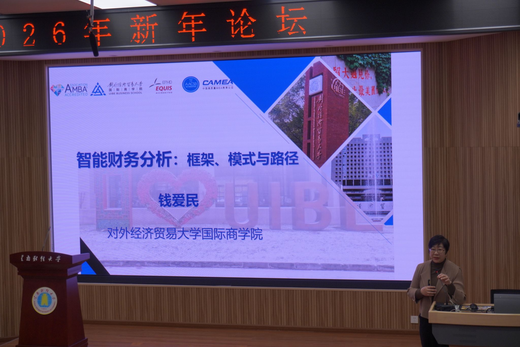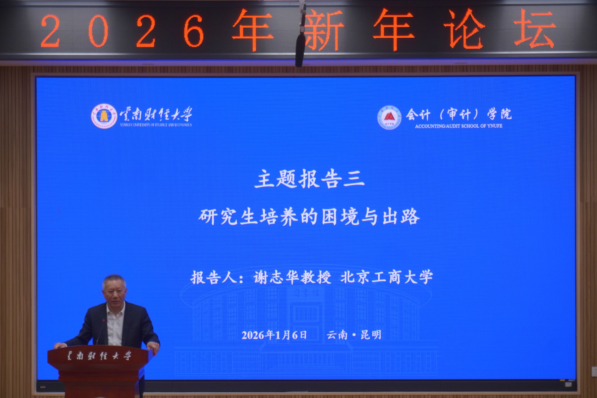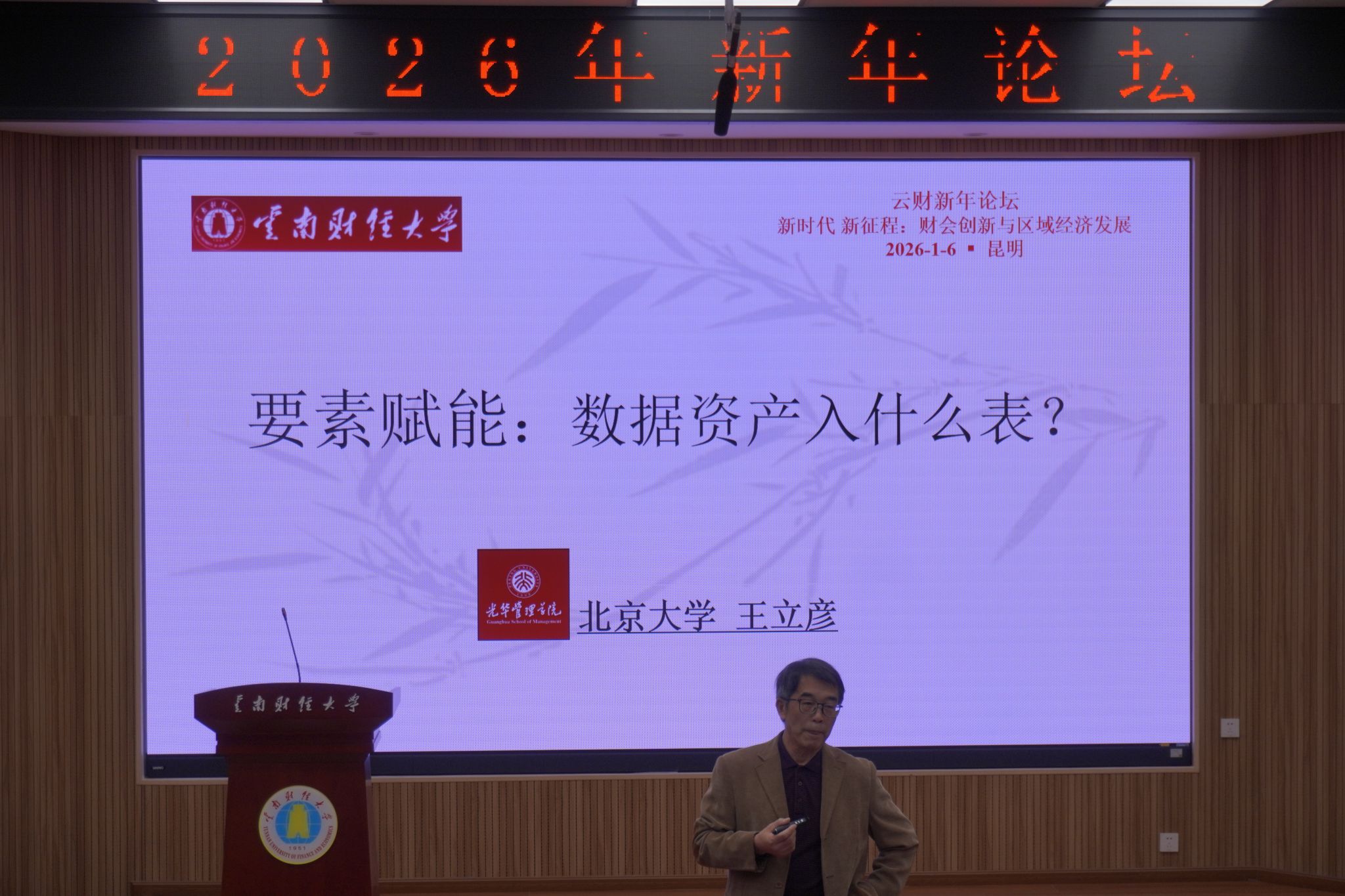 2026年1月6日,“新时代·新征程:财会创新与区域经济发展”2026年新年论坛在云南财经大学龙泉校区成功举办。本次会议由云南财经大学主办,云南财经大学会计(审计)学院承办。云南财经大学党委书记陈红教授、云南财经大学副校长余怒涛教授、北京大学王立彦教授、北京工商大学谢志华教授、西南财经大学赵德武教授、中南财经政法大学张敦力教授、对外经贸大学钱爱民教授、暨南大学沈洪涛教授以及云南财经大学120余名师生代表参加会议。