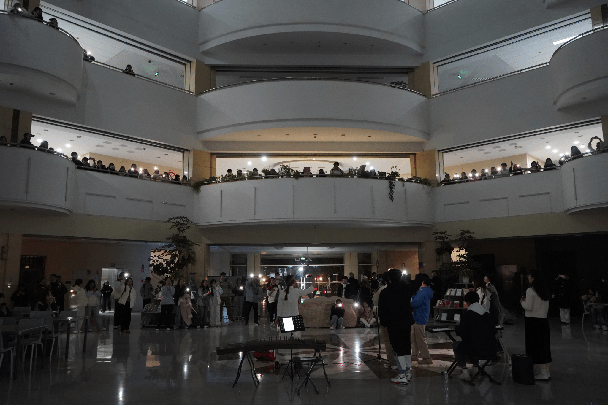 2025年12月18日21:40,会计(审计)学院在图书馆一楼大厅举办了“三进一出”之“研途清韵·逐光上岸”考研助力音乐疗愈快闪活动,为即将考研的学子送上祝福。