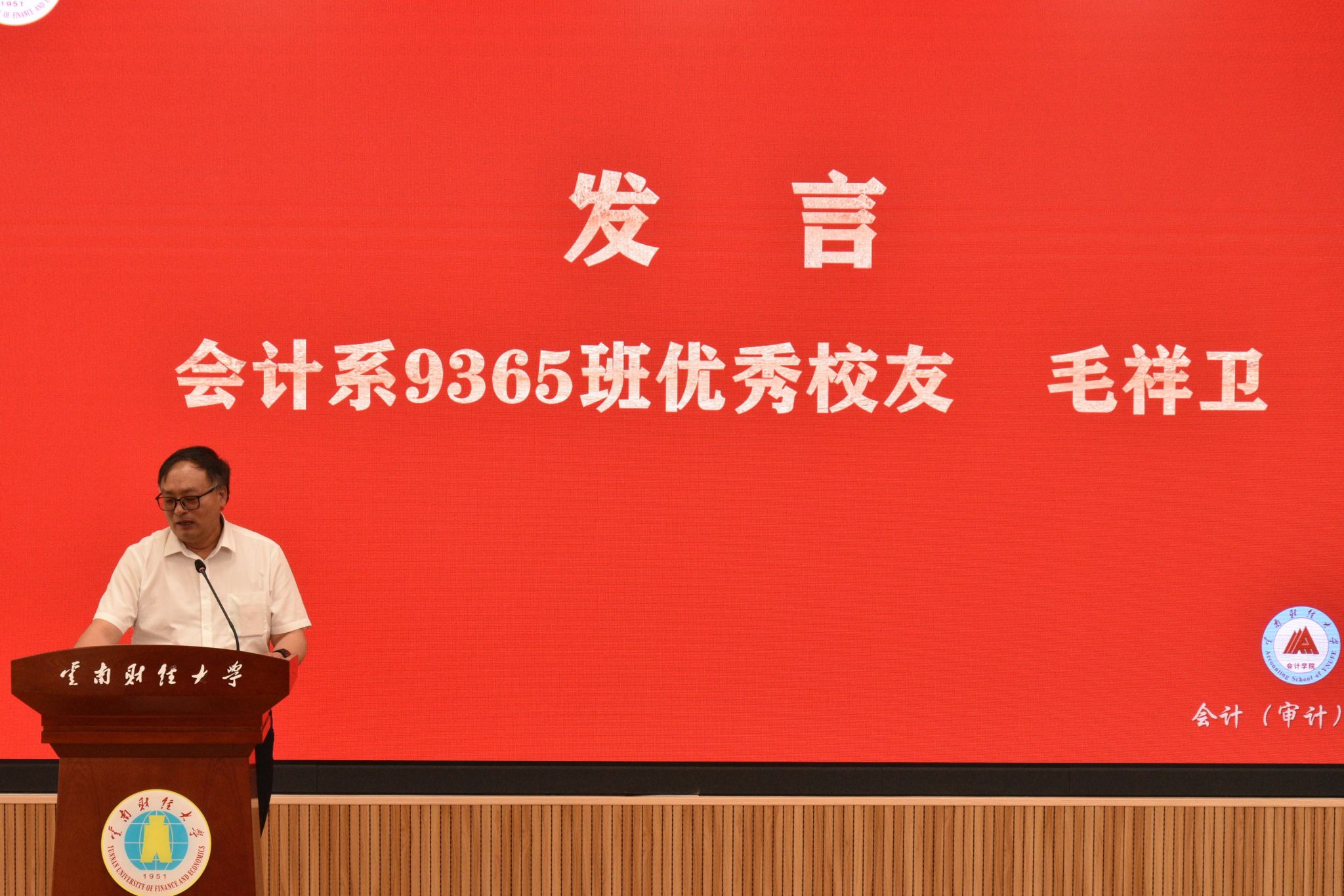 会计系9365班优秀校友、西藏鑫湖矿业财务总监毛祥卫作交流发言。他工作在海拔5200米的青藏高原,秉持着“缺氧不缺精神,艰苦不怕吃苦,海拔高境界更高”的精神信条,在祖国需要的地方挥洒热血,令人感动和敬佩。