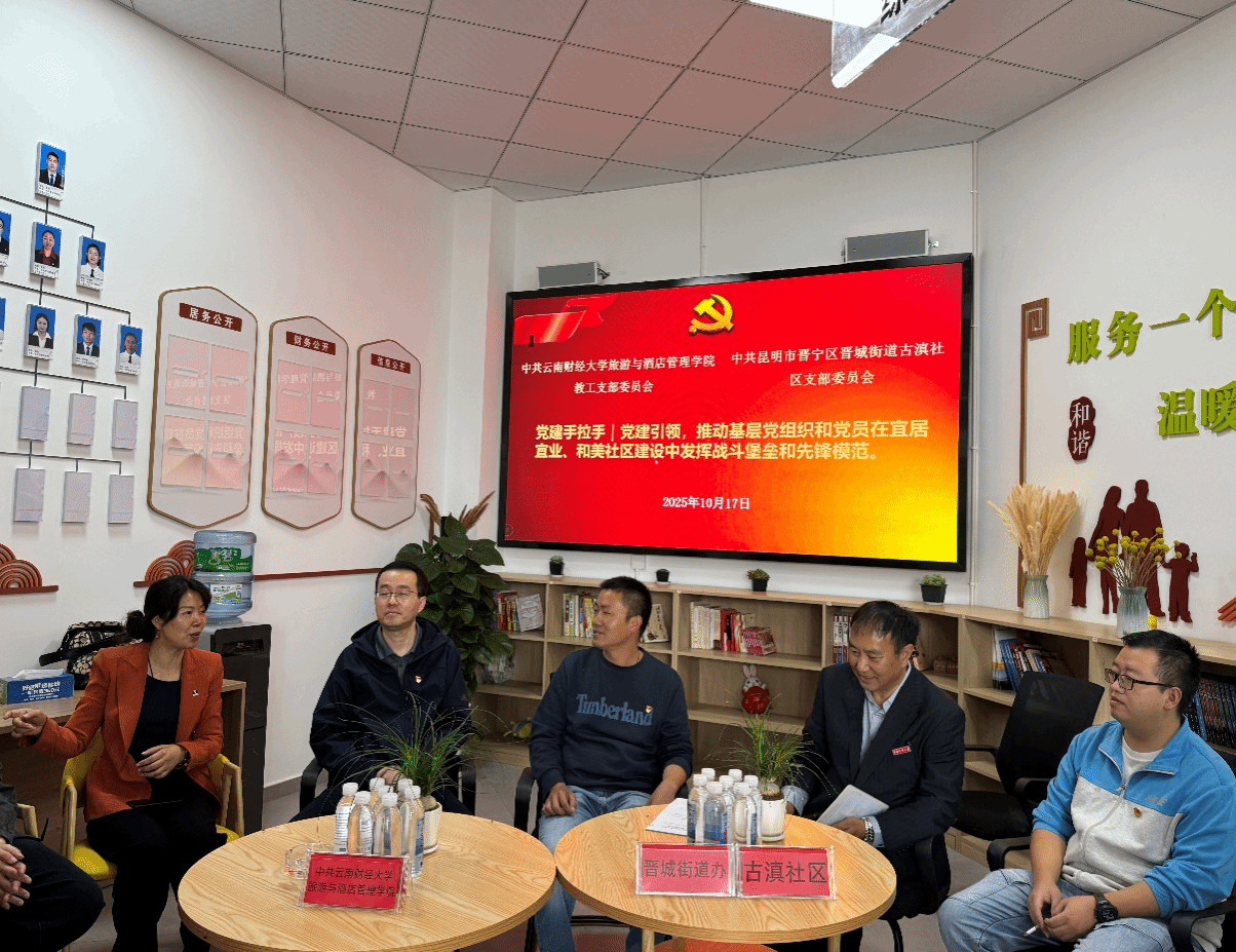 为进一步推动学科建设、学术科研与社会需求相结合,调研社区治理、农文旅融合发展情况,促进学院毕业生就业和人才培养工作提质增效,10月17日上午,旅游与酒店管理学院教师一行在党委书记朱睿带领下赴昆明晋城街道古滇社区开展党建共建活动。