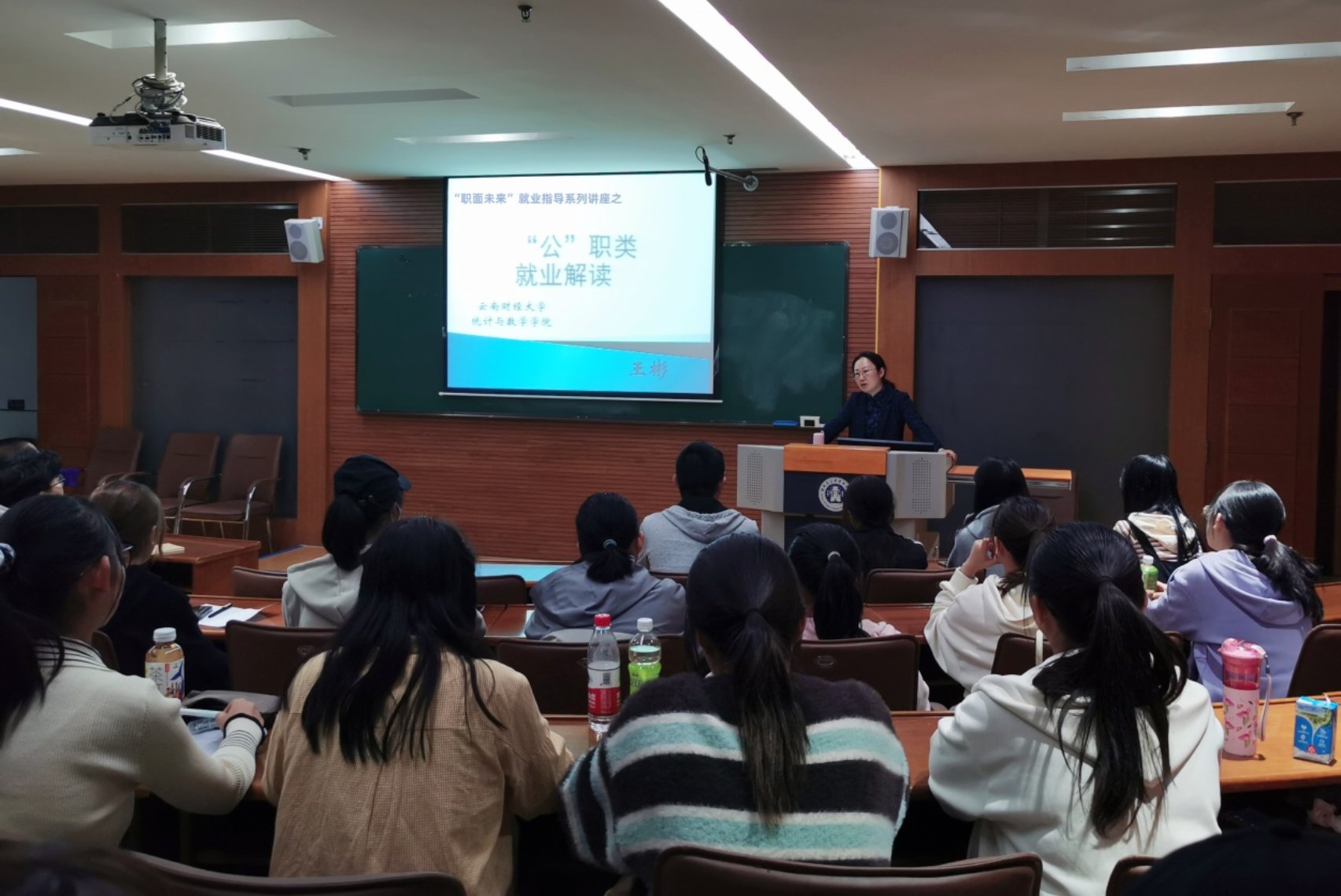 王彬为同学们分析了近年来的就业形势,提出对职业选择要建立科学理性的认知,鼓励同学们提前规划,尽早就业。她详细解读了公职类考试类型、岗位设置、报考条件、发展前景等内容,以详实的数据和案例向同学们介绍了不同地区、不同岗位的考试情况,并就如何报考选岗、复习备考给出指导建议。为帮助毕业生提升应试能力,王彬还讲解了行测中的数量关系与资料分析速算技巧,并就同学们的个性化问题进行了耐心解答。